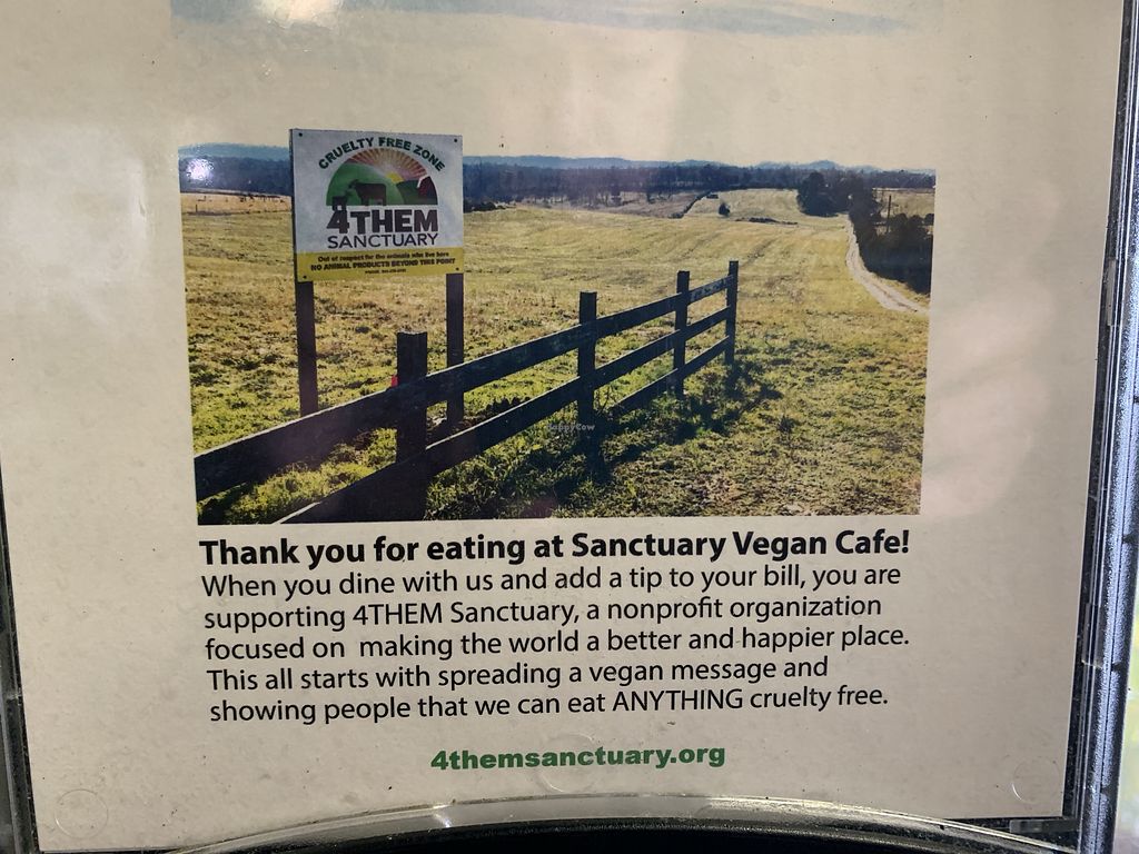 I was really surprised at how delicious the food was. The service was wonderful as well. We were greeted as soon as we walked in. Was given menus with plenty of options. Will definitely be my go to spot from now on. The atmosphere is great with great art on the walls to enjoy. All tips go towards the sanctuary.