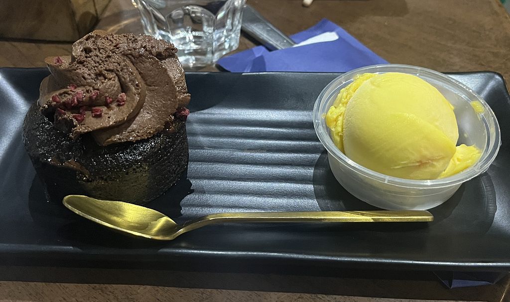 The vegan chocolate cake was very good! It came with mango sorbet, which was a bit too sweet, but still very fruity, and even with a chocolate frosting!! I was really happy to finally have found some cake haha