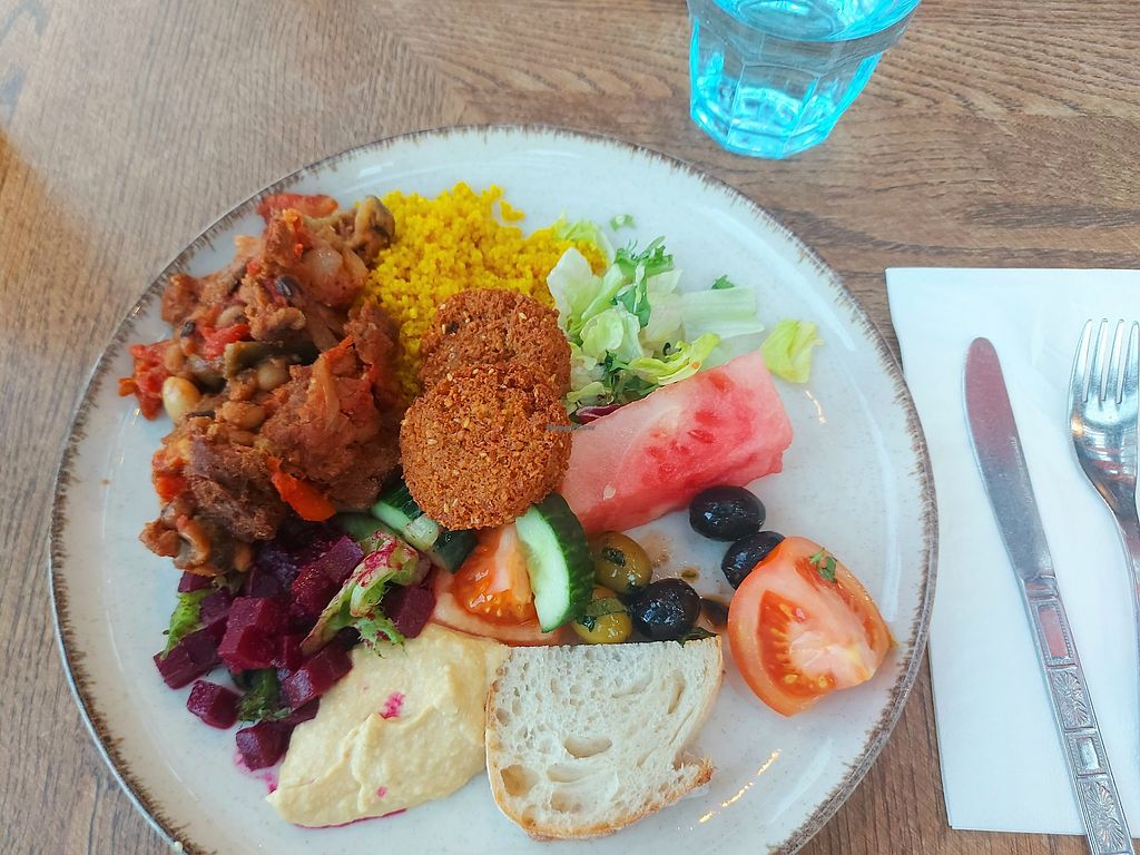 Buffet plate with tofu stew, falafel, salads and dips