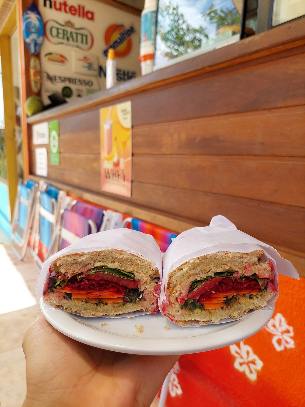 Serves meat, vegan options available. Sandwich shop on a beach offering coffee, sandwiches, and cake. Vegan options include a falafel sandwich and an acai bowl. Ask for no butter on the sandwich. Open Mon-Sun 8:30am-6:30pm.