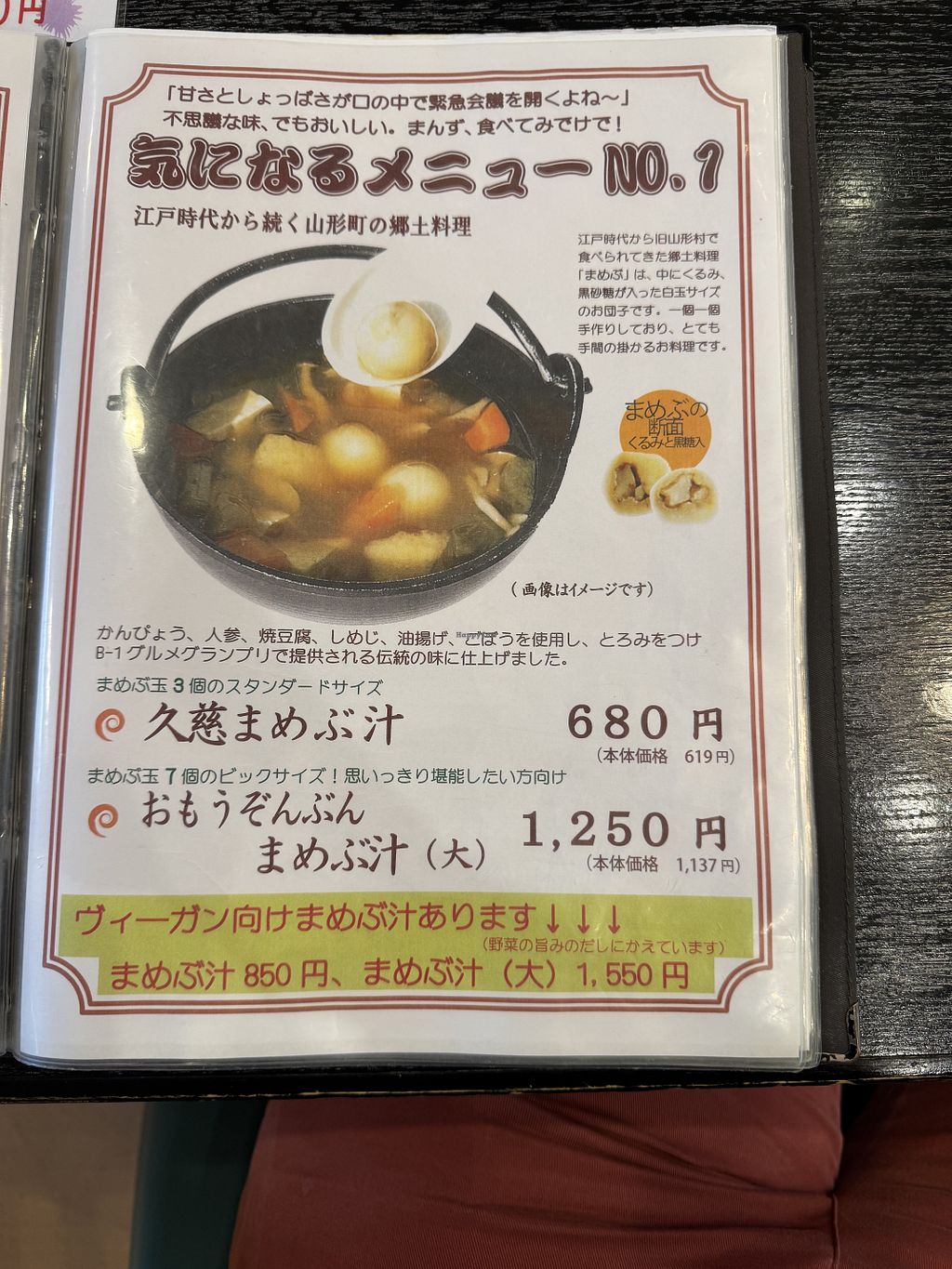 Serves meat, vegan options available. Restaurant offering mamebu soup that can be made vegan with vegetable soup stock. Also offers grilled tofu, burdock root, deep-fried tofu, shimeji mushrooms, kanpyo, and dumplings with walnuts and brown sugar. Open Mon-Sun 11:00am-5:00pm.