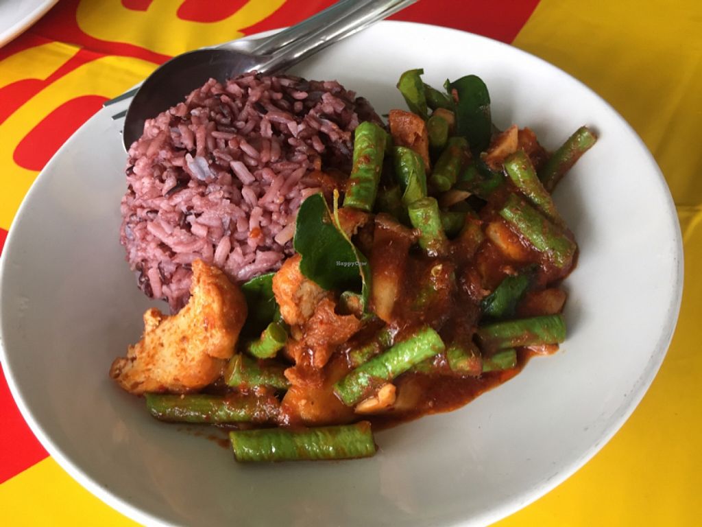 This is a small family-run spot with incredible food. We got the stir fried green beans and tofu with red curry (35 baht) and tom yum mushroom soup (40 baht). Both were delicious!