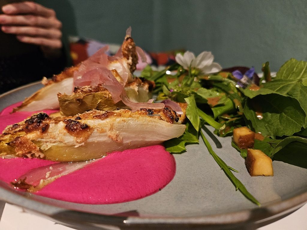 Chicory on beetroot curd with tofu cubes and wild herb salad