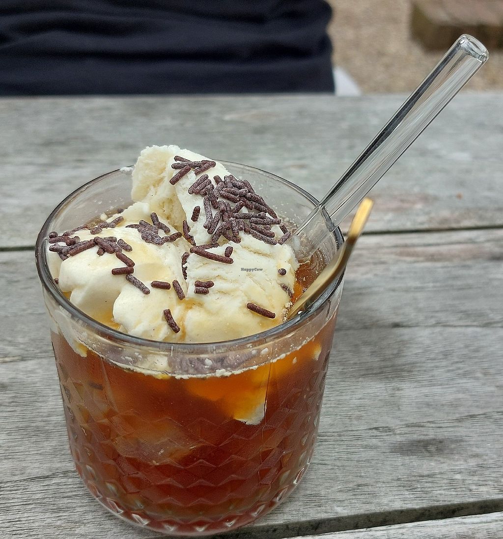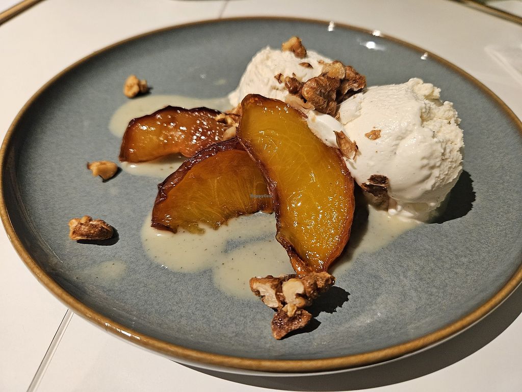 Vanilla ice cream with cream caramel, grilled peach & walnut crunch