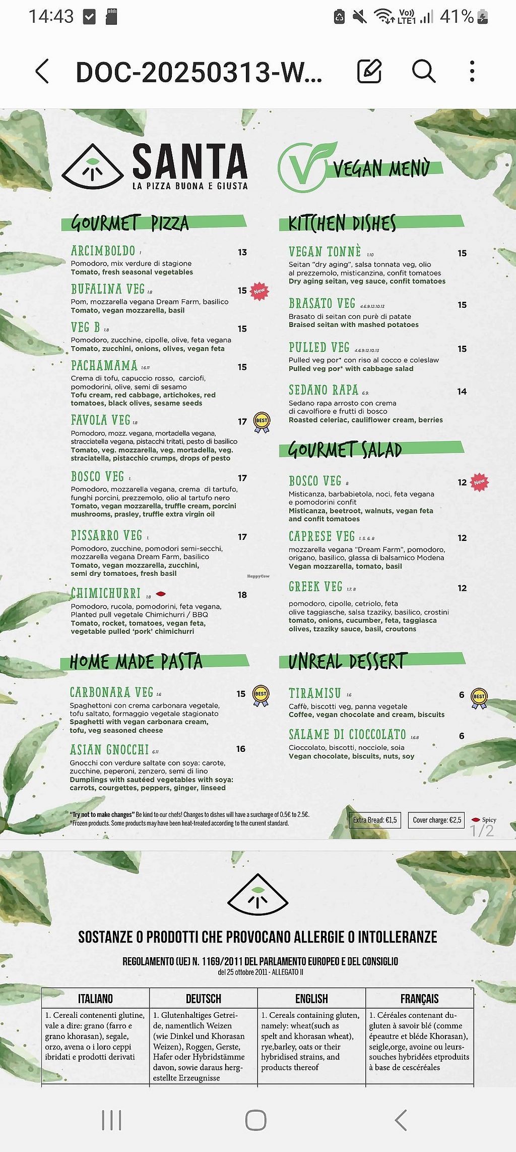Vegan menu