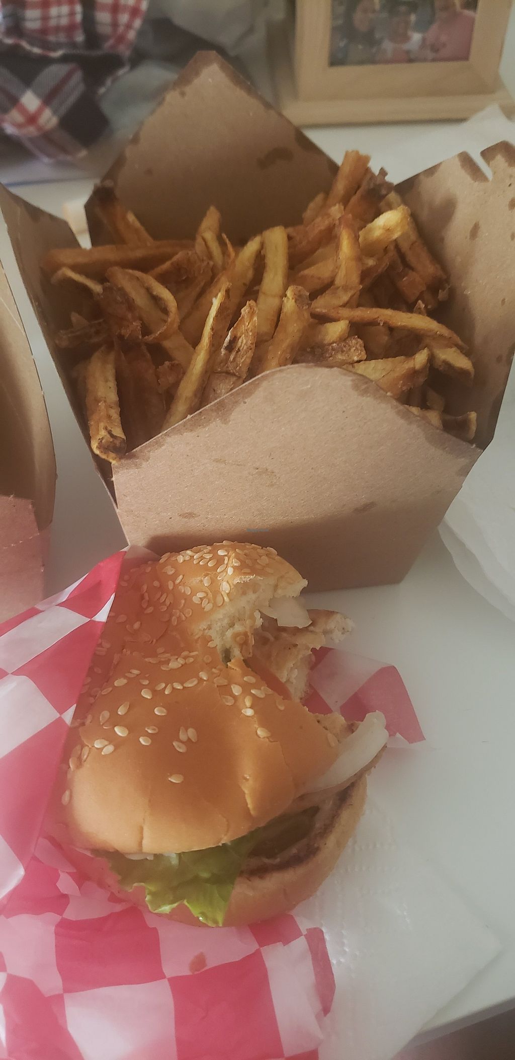 "Chicken" Sandwich, Fries, and Strawberry lemonade