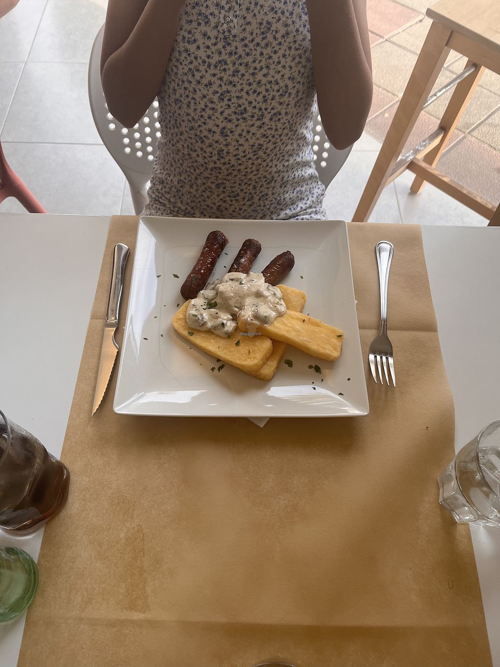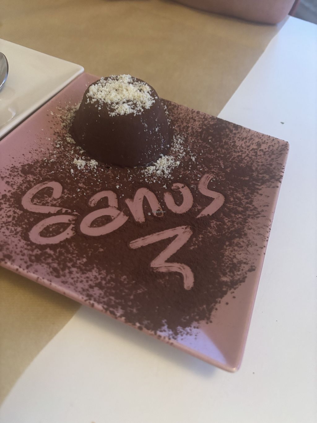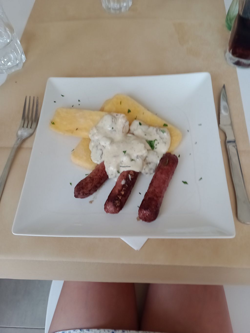 The starter was amazing, I got the grilled tofu on wakama seaweed and it tasted amazing.Then got a delicious soy sausages dinner with polenta and rosemary garlic sauce. For dessert I ordered the panna cotta, it was amazing and had loads of taste. When you order your drinks they offer water for the table and brought out a small bowl of olives,with your starter they offer you some bread. In total I would recommend the restaurant to most vegans who like this type of food, they also do none vegan options and it's all gluten free.