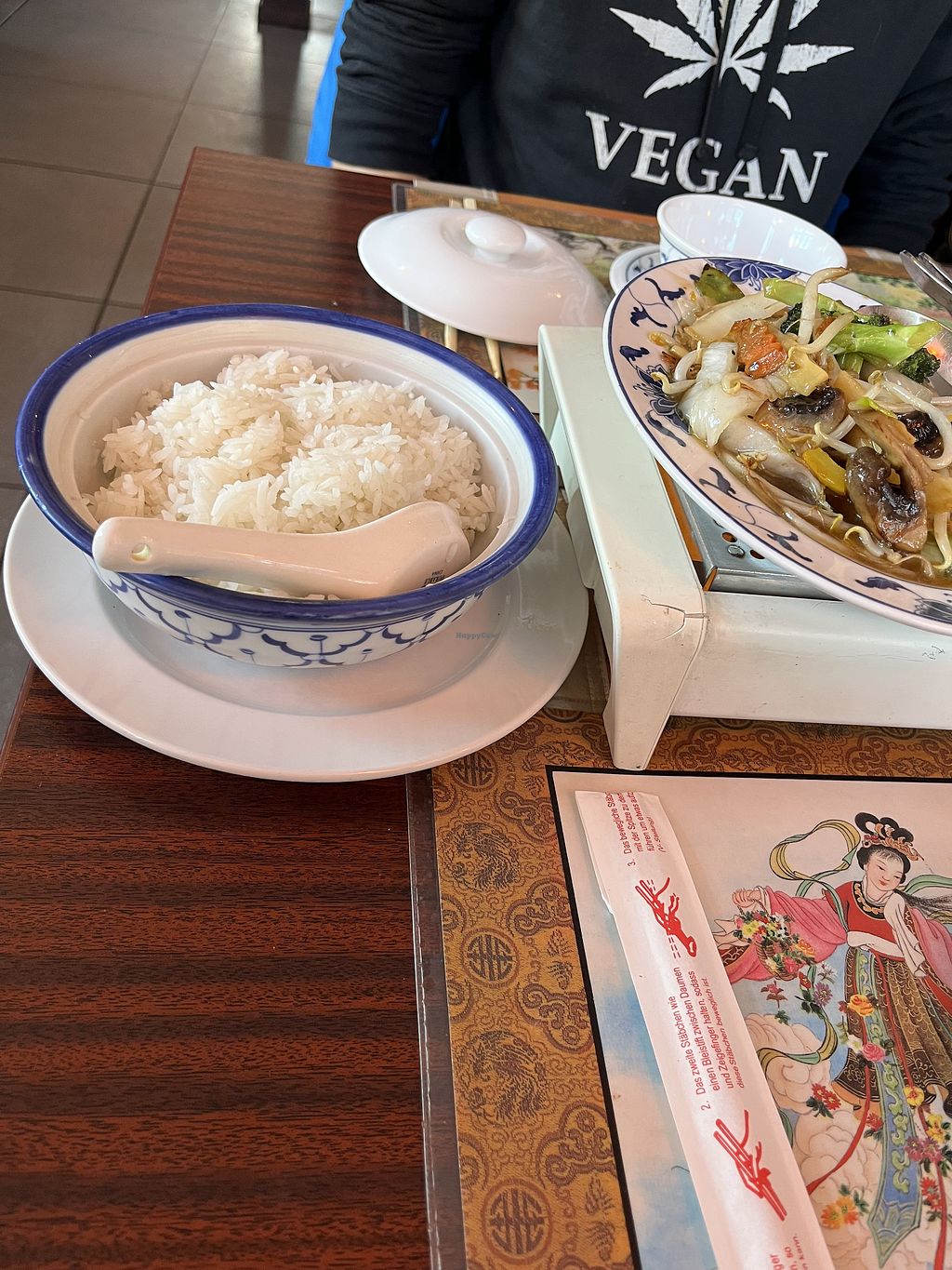 Wir haben das Mittagsmenü gewählt und haben anstatt der normalen Frühlingsrollen auf Nachfrage vegane Frühlingsrollen als Vorspeise bekommen. Die Hauptgerichte sind nicht als vegan gekennzeichnet, jedoch kann man beispielsweise bei den Nudeln das Ei abbestellen.