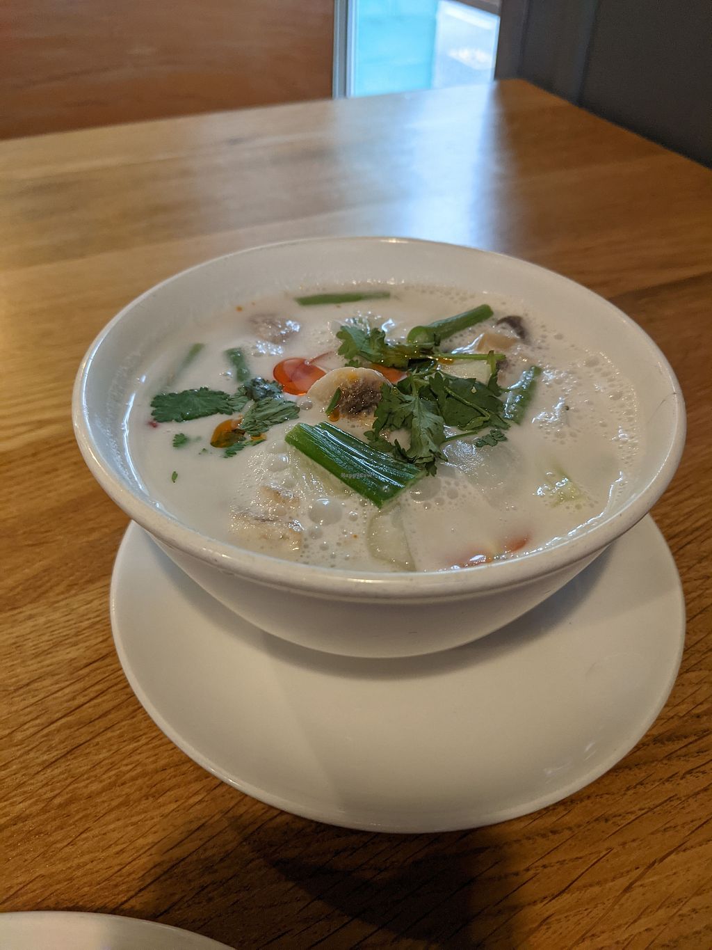 I had the Pad Thai noodles which tasted great after I added soy sauce as the dish is more sweet than savoury. I also had the Tom Kha as a starter which is quite filling, but uses the same veggies from the noodles and tasted more like boiled veggies in coconut milk so not one I'd try again. It would be nice if the veggies were at least of a different shape to what they are in the noodles.