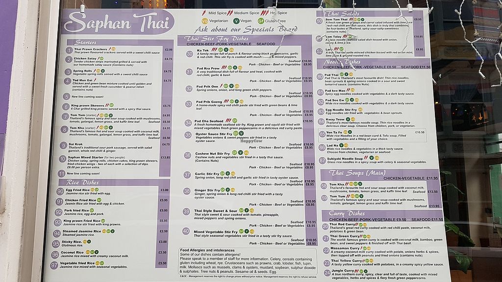 Serves meat, vegan options available. Family owned Thai restaurant, which offers clearly labelled vegan, vegetarian and gluten free options.