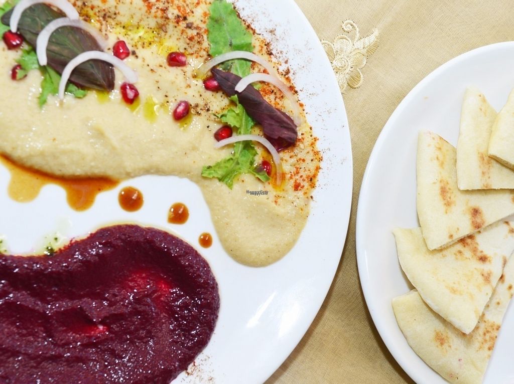Hummus, beetroot dip and pita