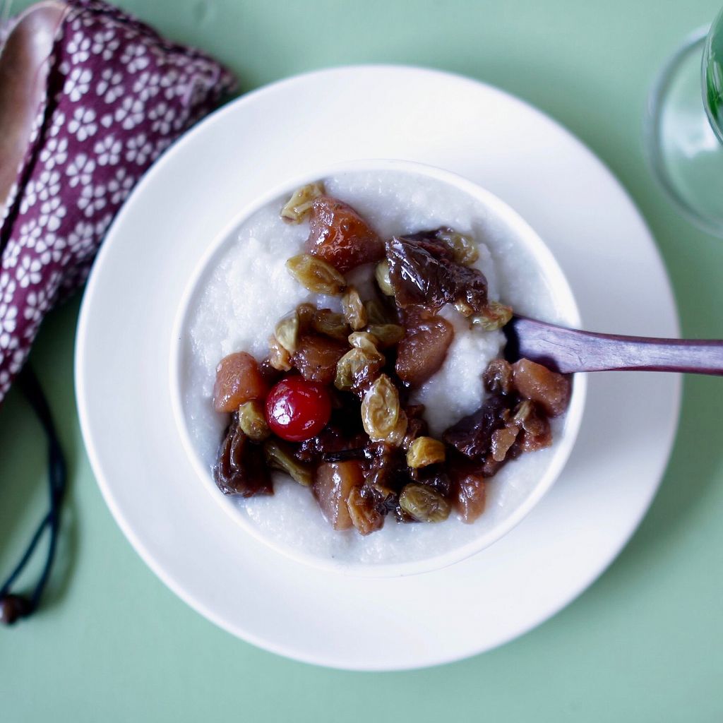 Rice pudding with fruit compote and coconut milk