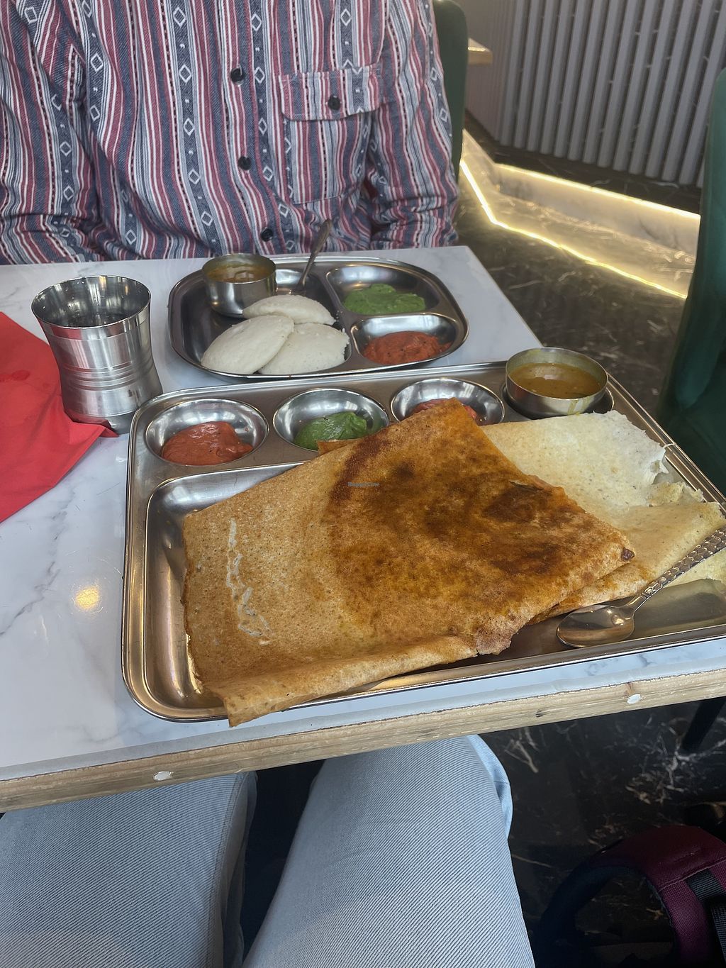 I had a basic masala dosa, it was cheap, had great dips and a small delicious sambar. The portion was huge, I am a small girl but I think that it'd satisfy most of the people. Huge recommend😄
