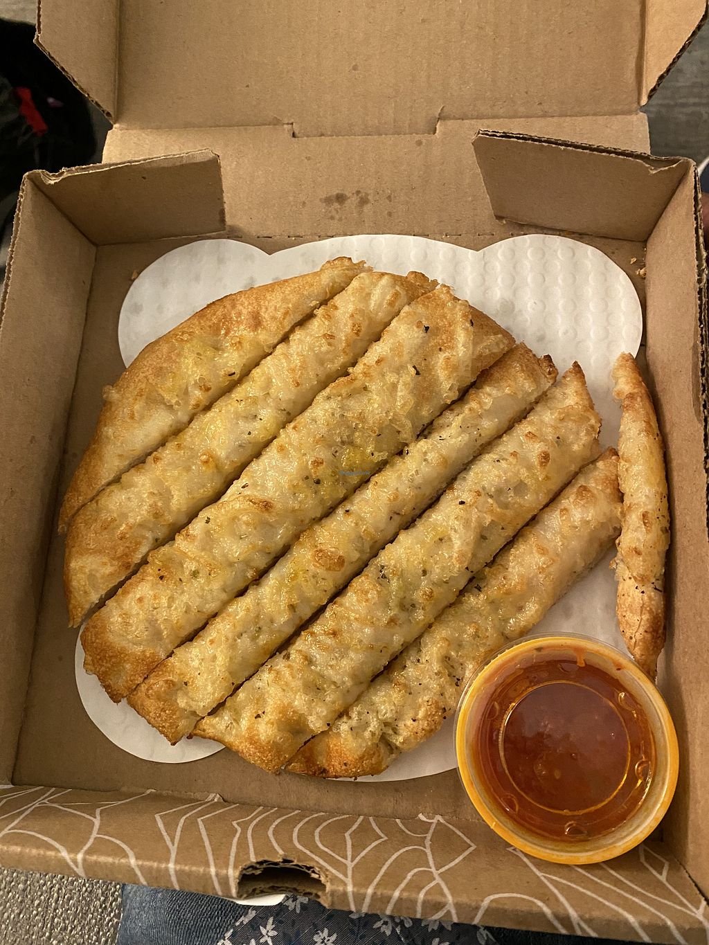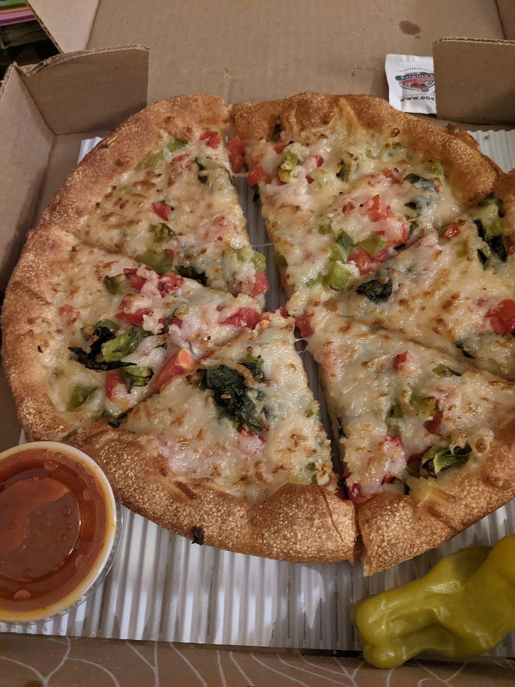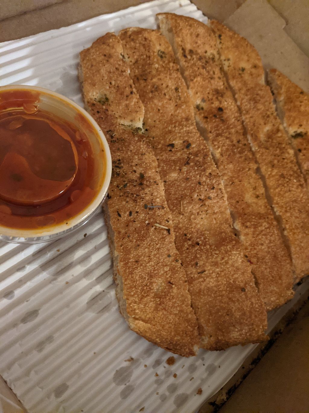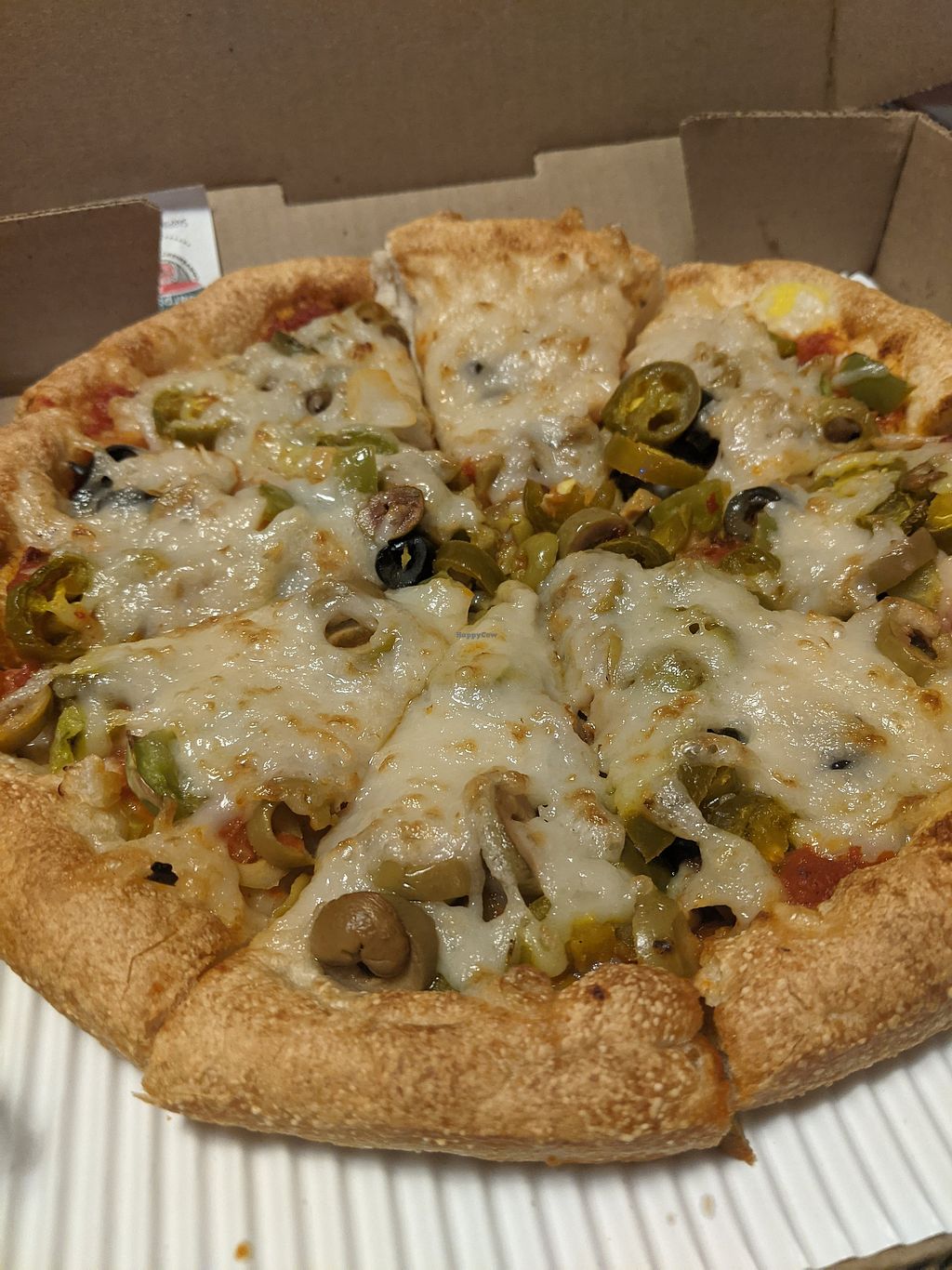 Midnight and I was looking for anything vegan to chow on. I ordered a small vegan Mediterranean and vegan cheesy bread. I enjoyed both and my late night craving was satisfied. Menu has many vegan pies. Give it a try if you’re in the mood for pizza.