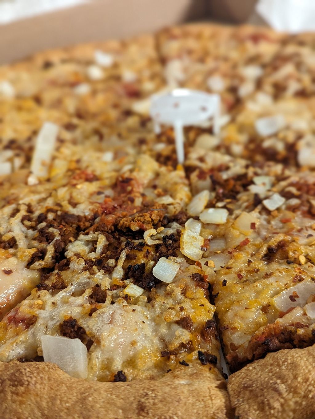 Very good vegan pizza! I got vegan cheese (daiya brand), onion, garlic and Beyond sausage on mine. Nicely cooked, nice melted cheese, great crust. It was a little under-sauced and under seasoned but overall was a solid pizza 🍕 8/10
