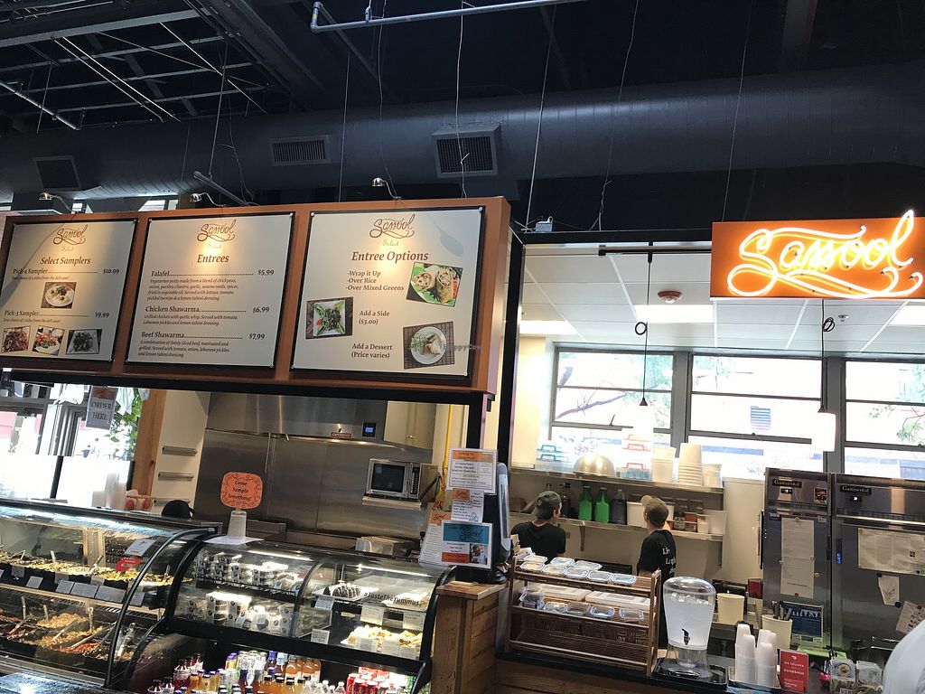This spot had clearly marked vegan options, including some desserts. I had the baba ganouj, majadarah, and sweet potato salad and my brother had the falafel. The falafel and sweet potato salad were the best, very tasty. The rest was ok. It’s in an area that is food court style, so not a real restaurant atmosphere. Obviously not big on presentation. Worth a shot if you are in the area and want a quick meal.