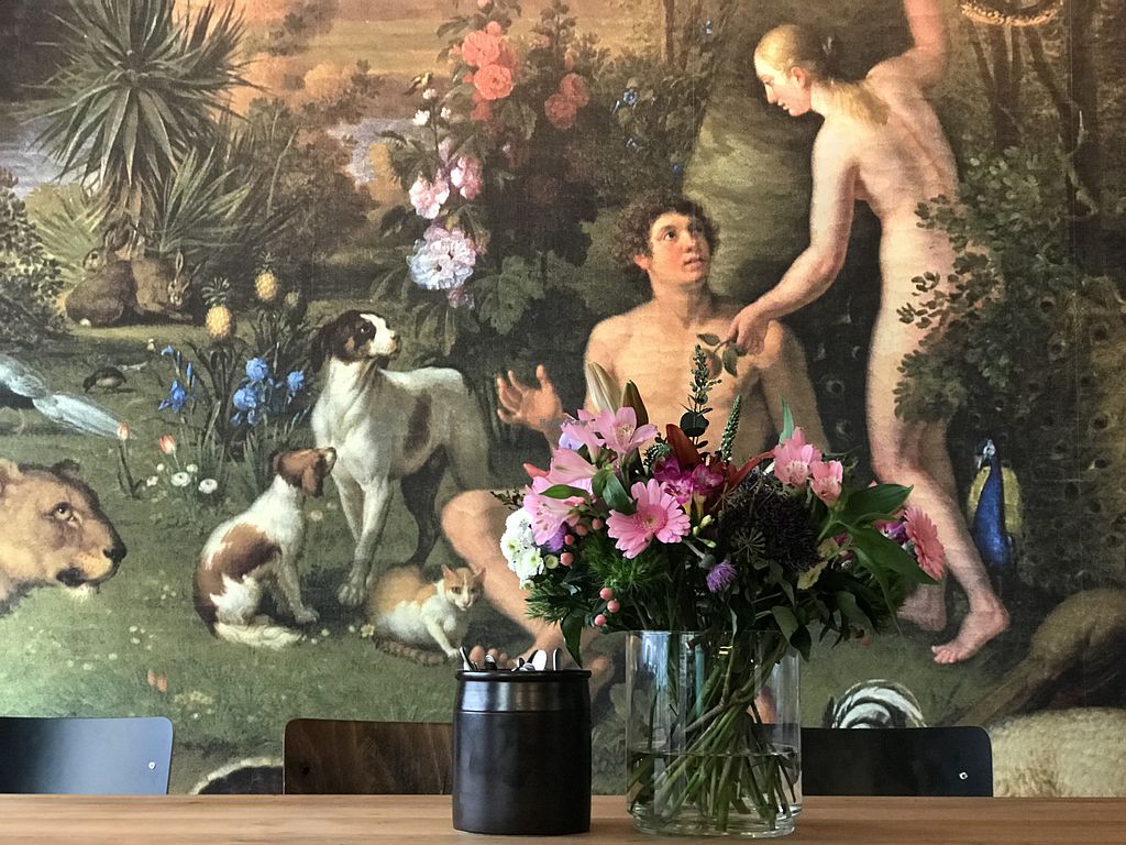 Great mural of Adam and Eve I’m Eden eating fruit and surrounded by an…