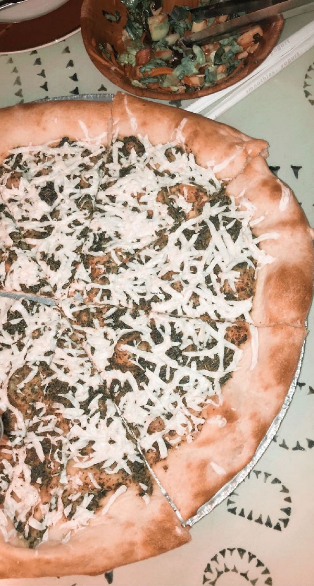 A few different options of vegan style pizza and they give you a personal sized pizza which is a perfect serving. 2 types of vegan cheese, bbq or plain tempeh, veggie toppings and pesto!!