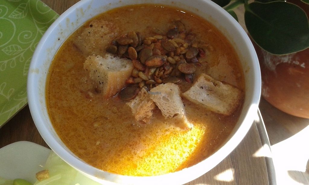 It's a cosy and lovely place to hang out for hours, right in the city center. Many people bring their laptops and work from there. There is space! The vegan soups and the vegan muffins are tasty. A selection of few vegan option.