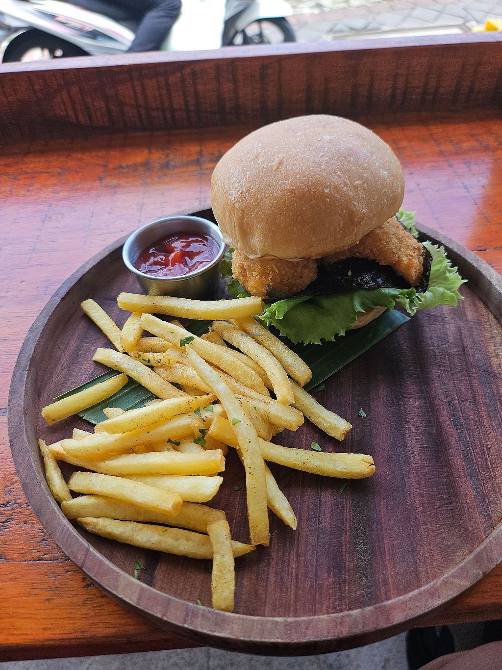 100% vegan with a nice choice of fast food type appetisers, mains and desserts. Food was prepared fresh and quickly. Large portions great choice of smoothies, iced coffees/teas, slushes and a beer. Lovely desserts. I personally tried the cauliflower wings, the shroom burger, fish fingers & fries and the Mexican Brorito also the corn ribs. Tried the lemon cake which was served with vanilla ice cream. Did several visits there as it was close to my hotel. Recommend it if you are in Kuta.