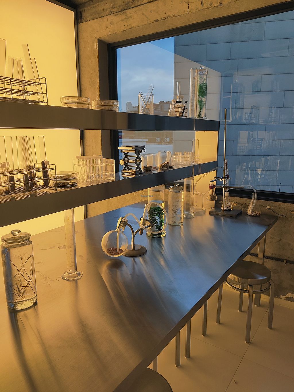 What I find most impressive or interesting here is the interior and its atmosphere: In the basement, there are a little pond, a waterfall and fish tanks (without fish). Upstairs are pseudo-scientific samples of seeds and other plant parts, as well as screens with videos of plant life. It's fun to explore the place!