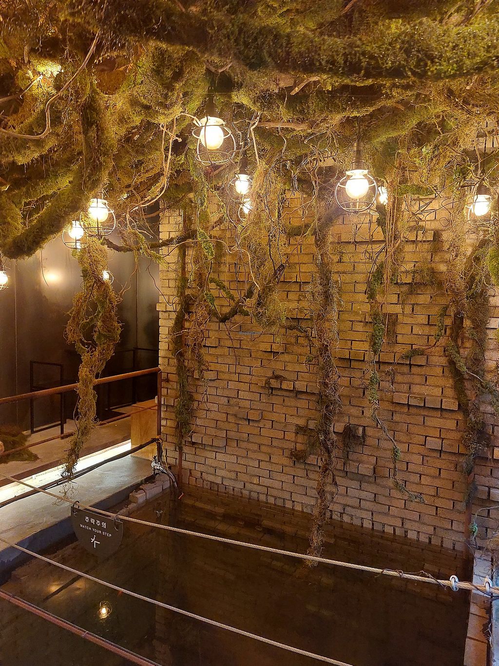 The cafe is worth a visit just for the interior. Each floor has a different design but I sat in the water level which had running water, trees, tanks and plants. Really unique and amazing design.