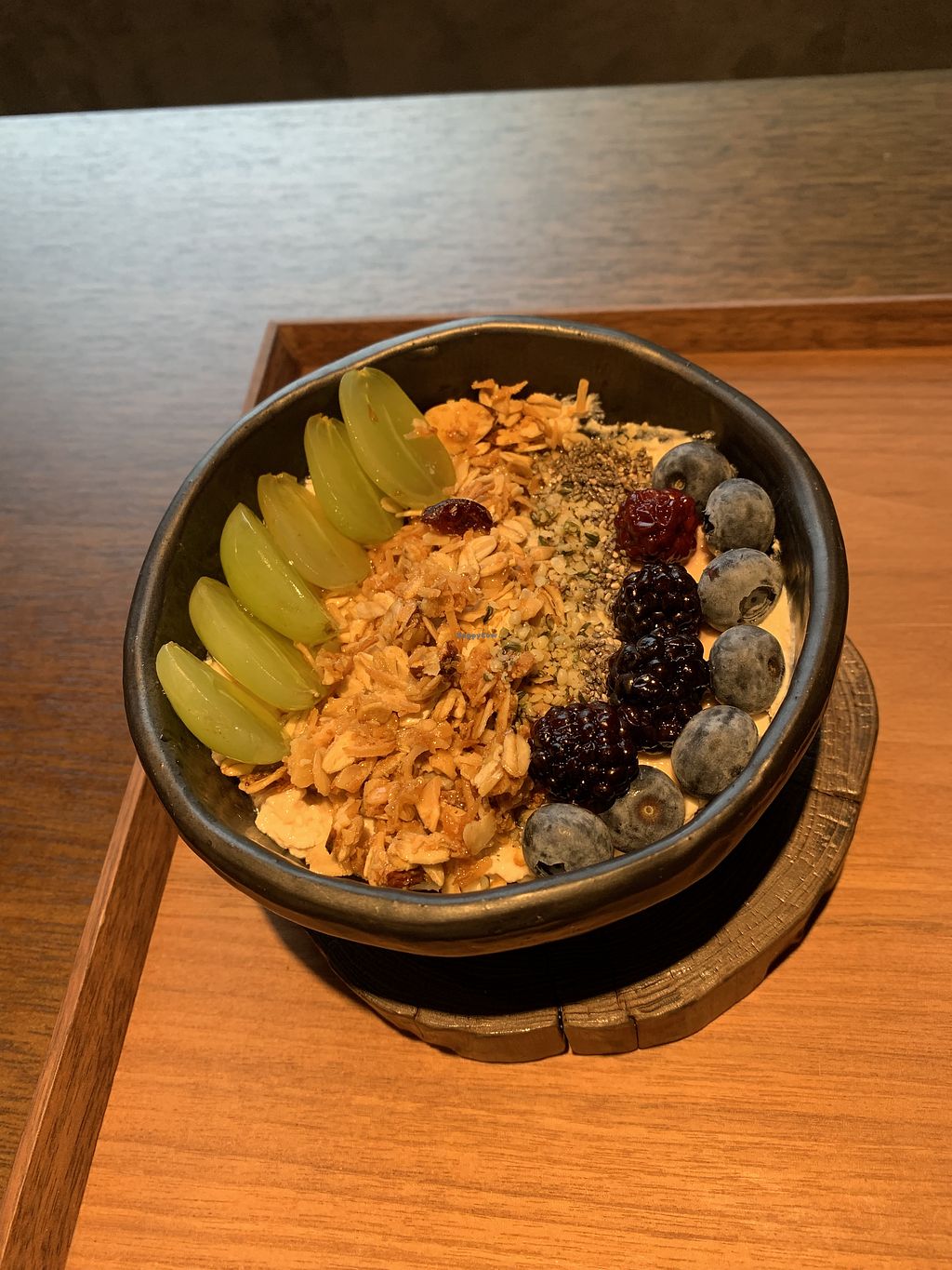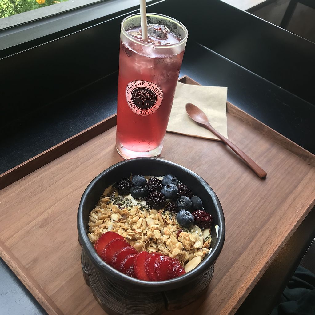 Triple berry yogurt bowl with hibiscus and rose ice tea