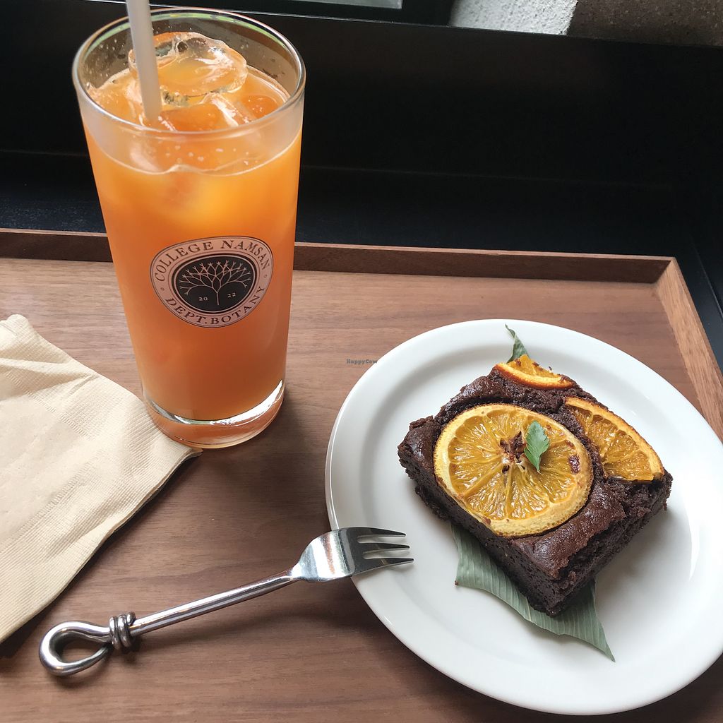 Chocolate orange brownie and fresh mango pineapple carrot juice