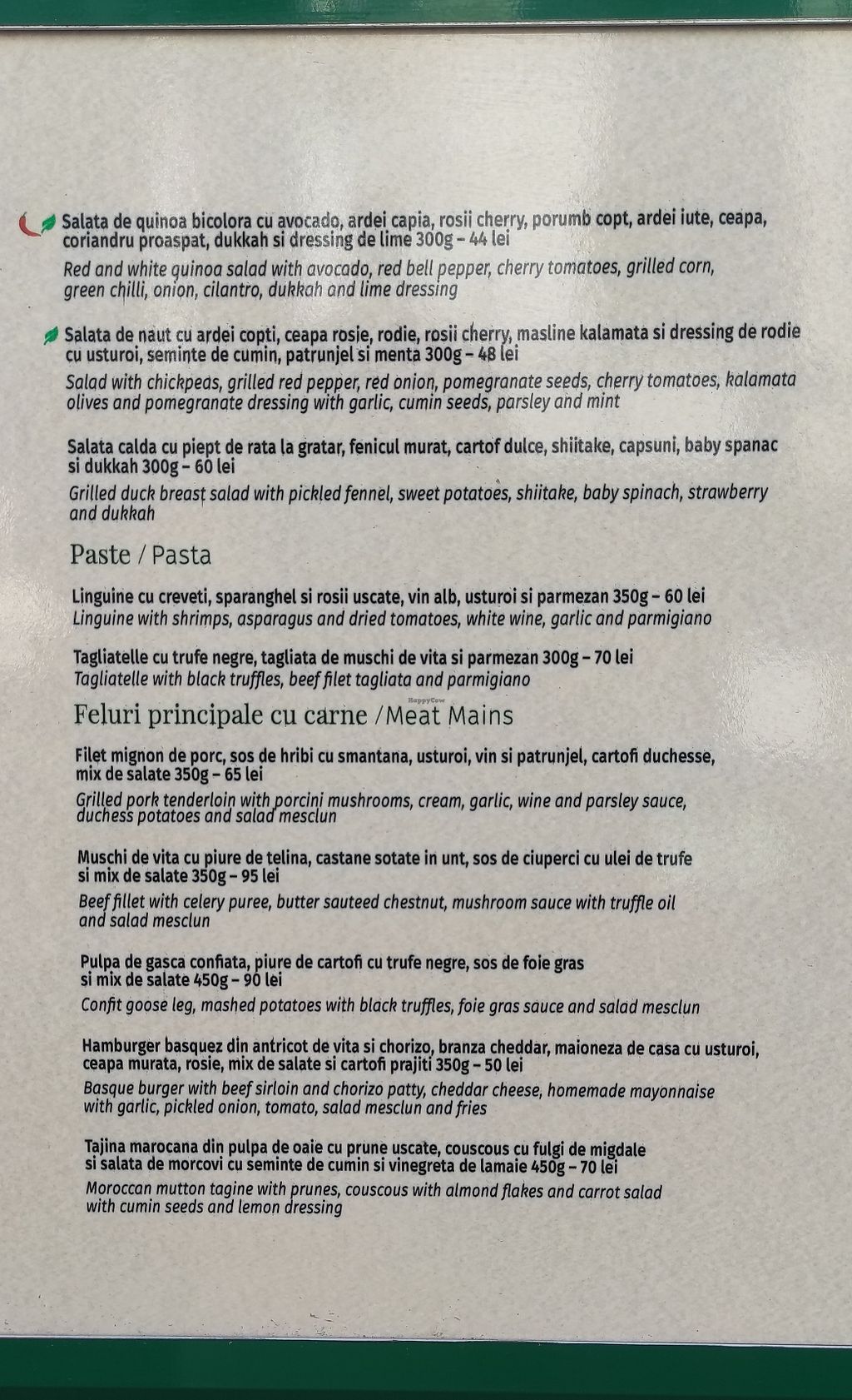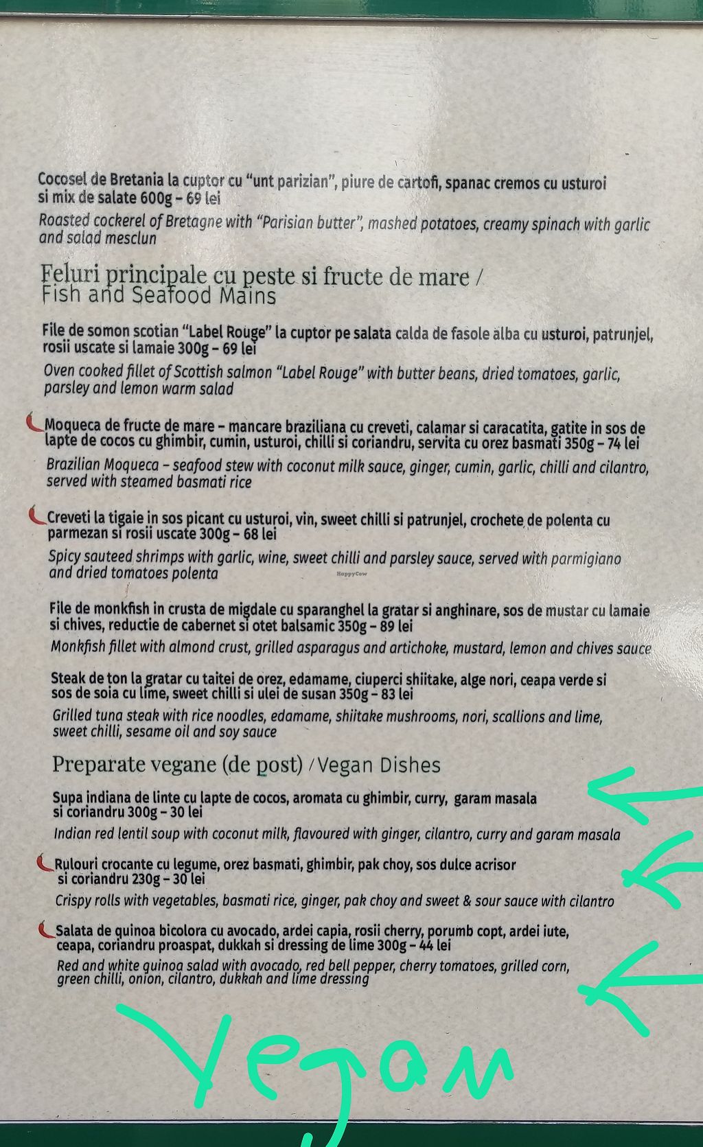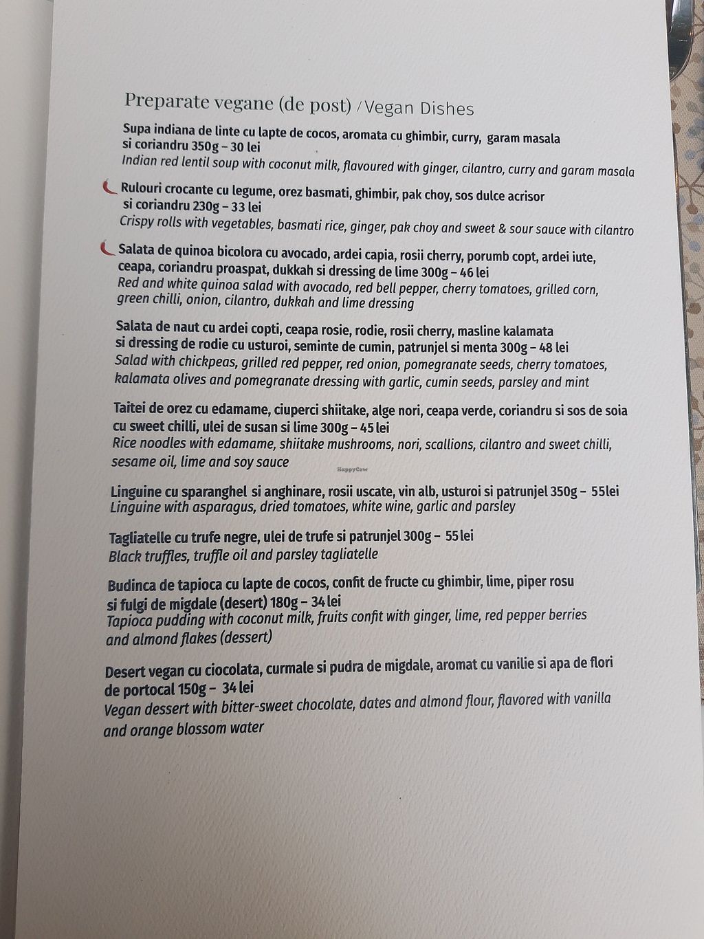 Serves meat, vegan options available. Romanian restaurant with a vegan menu section that includes salads, soups, noodle dishes, vegetable dishes and desserts. Removed December 2022: Limited vegan options.