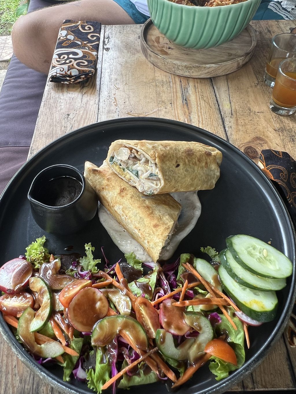 I’d probably only have given this a 2 star if it wasn’t for the pearcful location and nice staff. The Vietnamese spring rolls were just horribly bland and the thick sauce unfortunately didn’t help it. Likewise the high protein salad was slightly bland and just something not quite right. Spring rolls and tofu from salad had to go in the bin but the salad could be salvaged when mixed in with a creamy pasta dish (but wouldn’t order again). However I gave this place a 3 instead of a 2 for the peaceful location (assuming you can embrace the honks of Bali), nice staff and the chocolate truffle balls which were heavenly🤩.