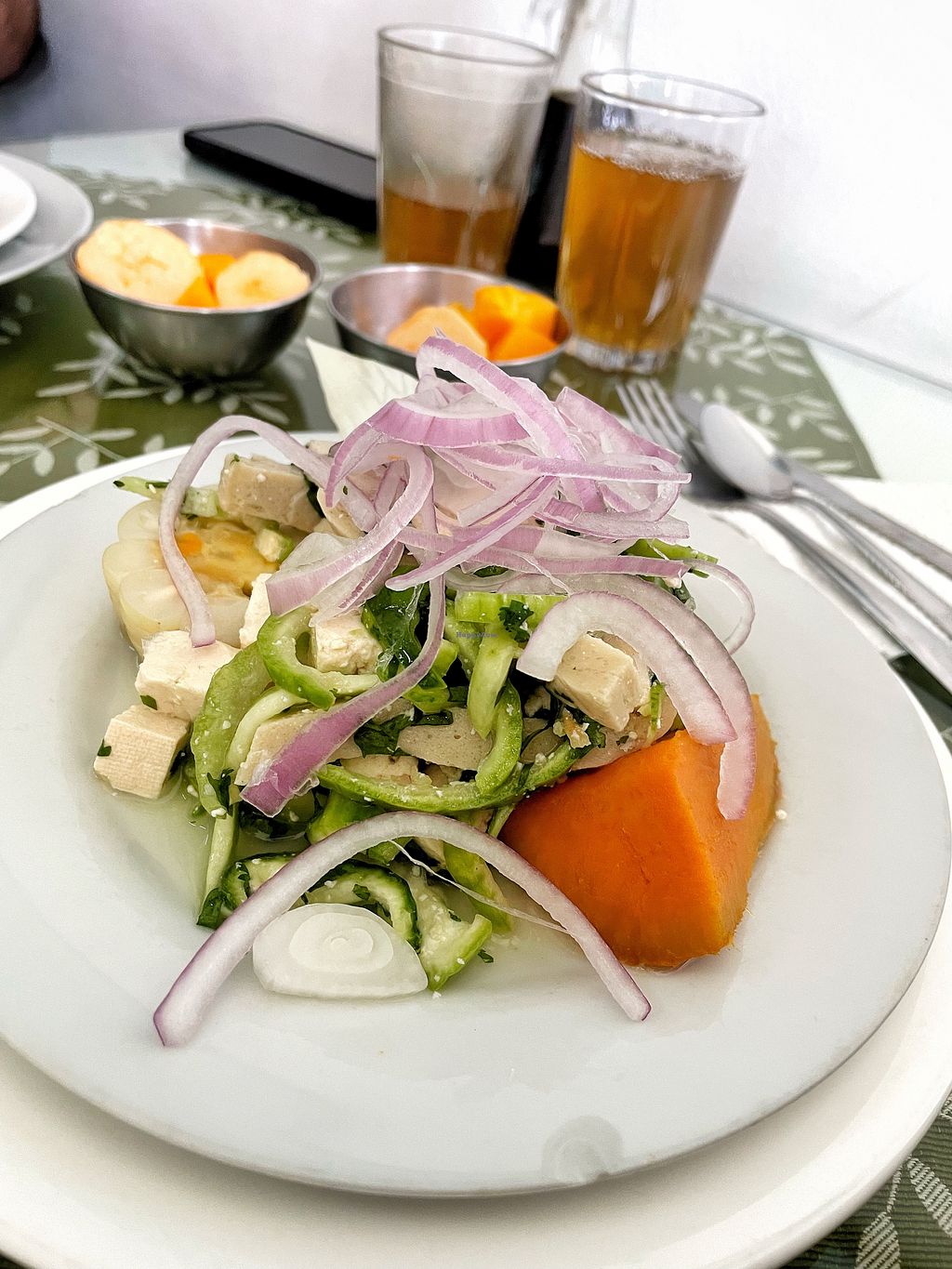 I arrived early on a 'cold', foggy morning in Lima. By the time this restaurant opened I was already hangry and very chilly so all I was craving was a hot soup which was very hard to find elsewhere since it always contains meat. I was absolutely happy when I heard the menu del dia comes with soup and a main dish. Even happier was I when I saw the soup was a huge portion. For the main dish I could decide between tofu with rice or faux meat balls and rice. The tofu came with a sweet sour sauce which wasn't my favourite but apart from that the food was decent and so filling. It cost 17 soles and had tea included.