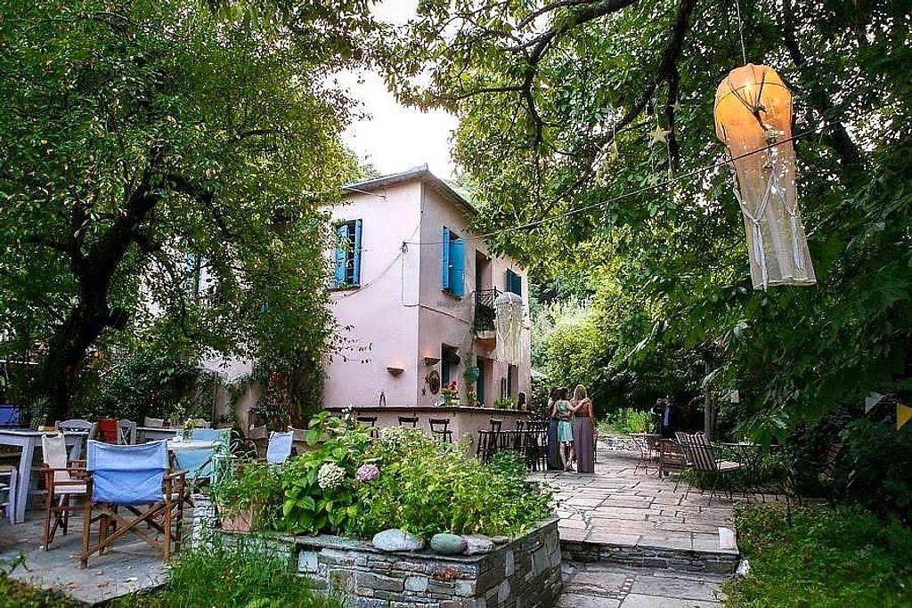 Serves meat, vegan options available. A pleasing place with music, tables among the trees and lights. Vegan choices may include mushrooms fricassee with tahini soup, pasta with eggplant, potato salad and kritamo.