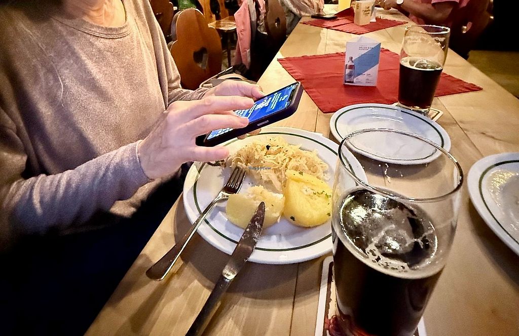 Schlenkerla isn't exactly vegan-friendly. They did have a kind of potato pastry that they normally serve with a nonvegan sauce, but for me, they substituted sauerkraut. Not the best meal I ever had, but at least it was filling and could soak up the Rauchbier (smoked beer), which was delicious.