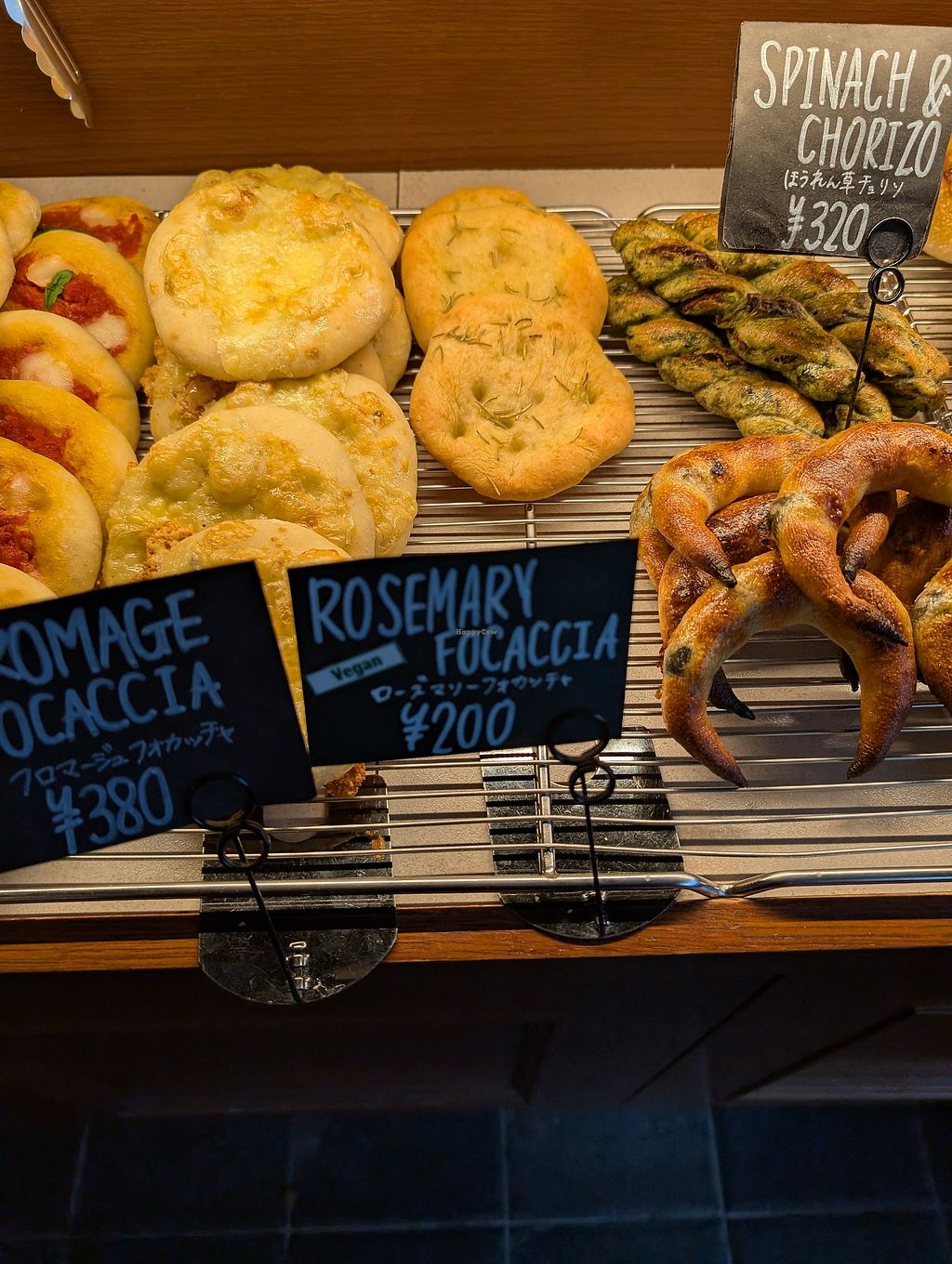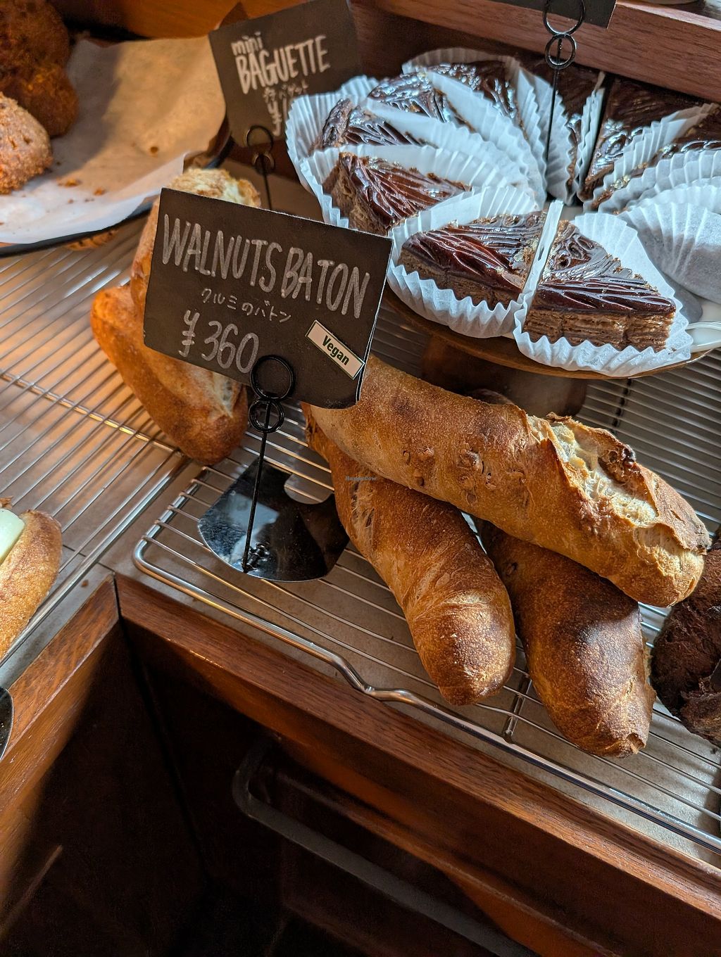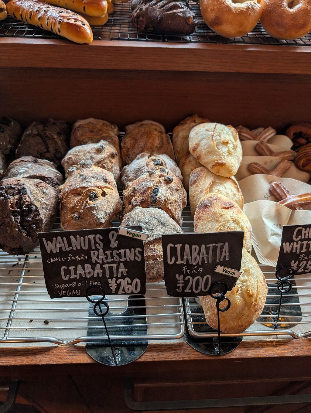 I stayed at the Hyatt Place next door and loved having this coffee shop next door! Their iced soy latte is delicious and they had several vegan bakery items when I went on a Saturday (pictures attached). I tried the rosemary focaccia and the walnut raisin ciabatta and both were tasty and satisfying. They also carry almond milk and oat milk. It was about 2,000 yen for 2 drinks and 2 pastry items.