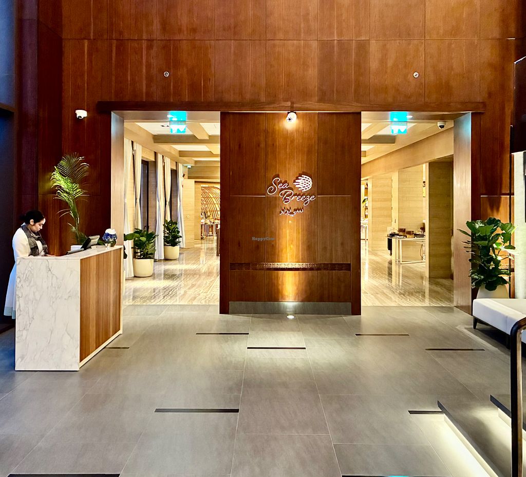 Serves meat, vegan options available. Buffet and à la carte restaurant within the Anantara Mina Al Arab hotel serving international cuisine. Open to the public. Vegan choices are clearly identifiable and include fresh-cut fruit, spring rolls, samosas, Buddha bowl, sea breeze salad, pizza, curry, balila, Mediterranean beetroot salad, grilled zucchini salad, foul madames, avocado toast, hash browns, coconut custard, sorbets, a salad bar, plus a selection of breads and condiments. Open Mon-Sun 7:00am-10:30pm.