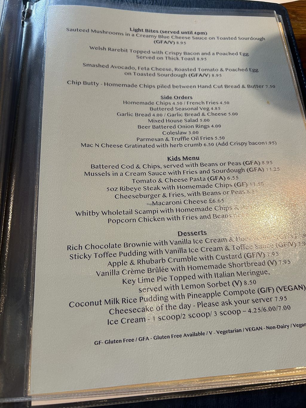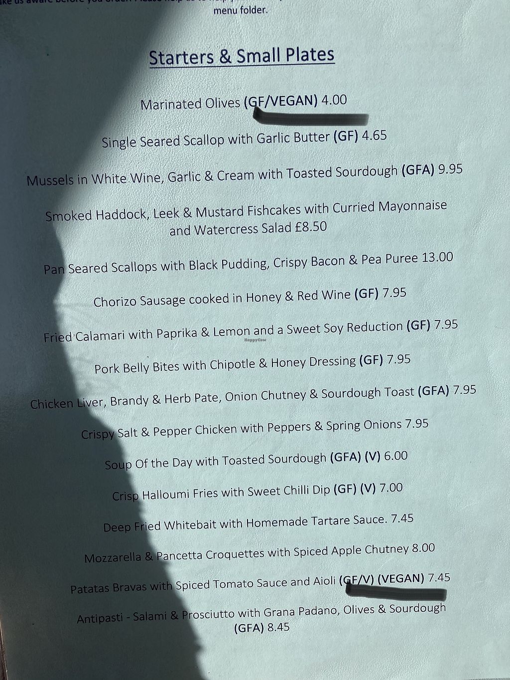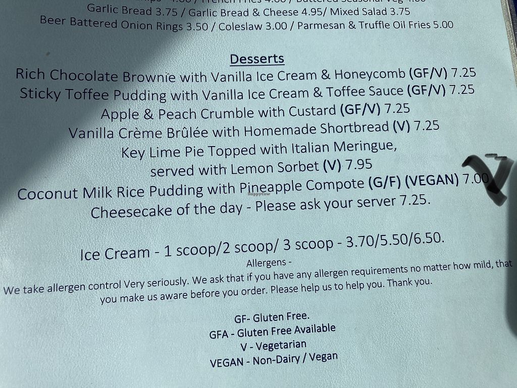 Would be nice to have a couple of options for a vegan meal. Only 1 offered. No vegan starter available or dessert, I asked and was told there was vegan ice cream but wasn't advertised on menu.
