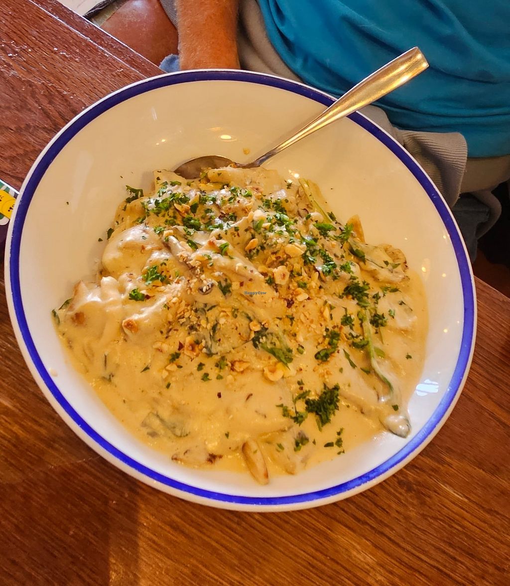 We just popped in for coffee and cake. Unfortunately, no vegan cake on offer so we just had a coffee with Oat milk. Server was nice and friendly. There are a few vegan opinions on the menu (see my photos) Be nice to see one vegan sweet item on the menu which every can eat not just vegans👍