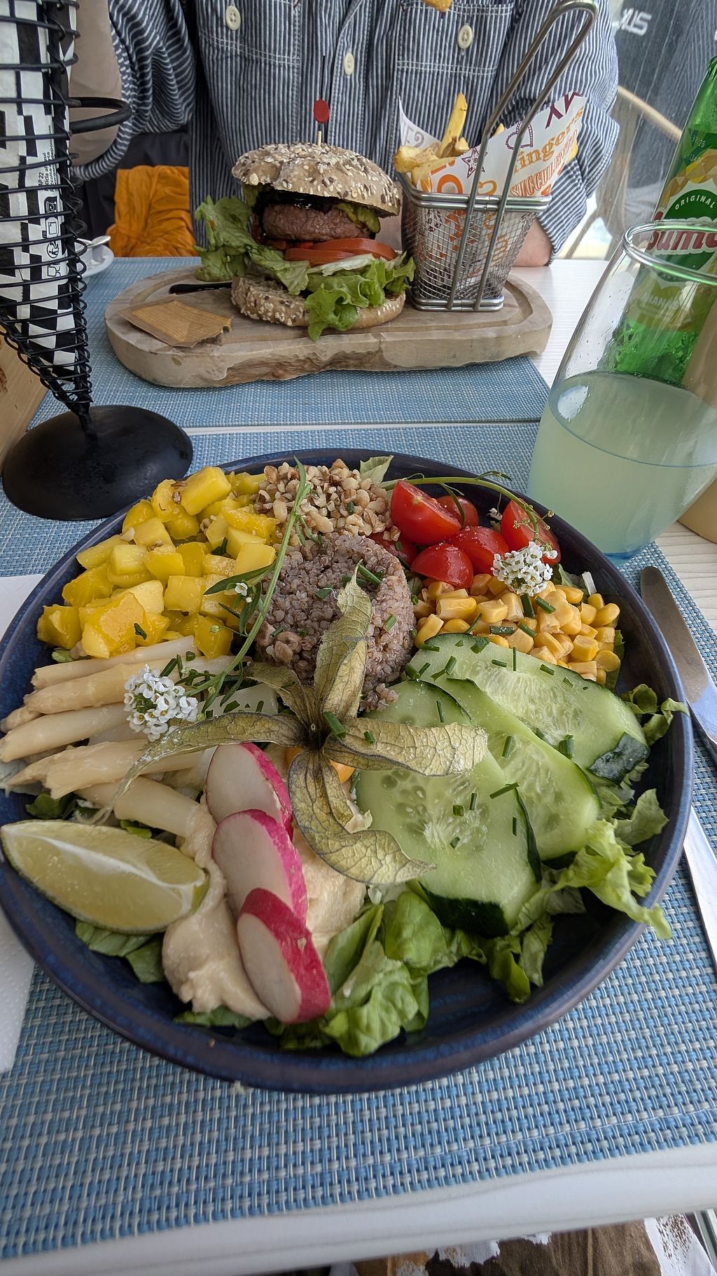 Vegan burger, Quinoa salad and a side of chips.