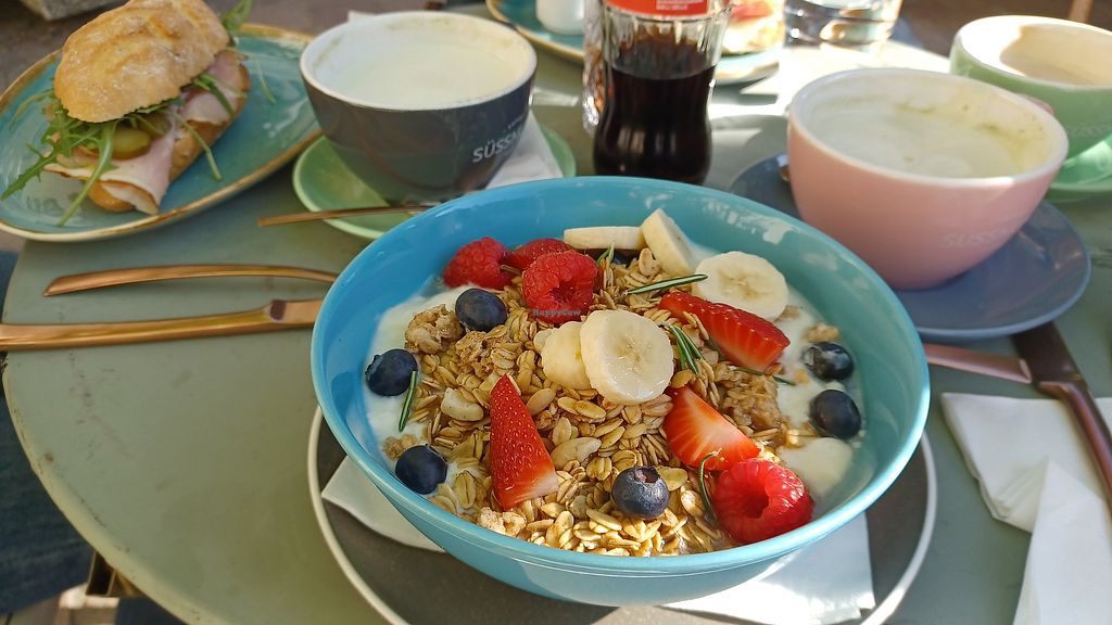 Serves meat, vegan options available. Brunch restaurant with clearly labeled menu. Example vegan offerings include avocado toast, coconut yogurt bowl, smoothie bowl and vegan cakes/baked goods. Open Mon-Wed 08:30-14:00, Thu-Sat 08:30-23:00, Sun 08:30-14:00.
