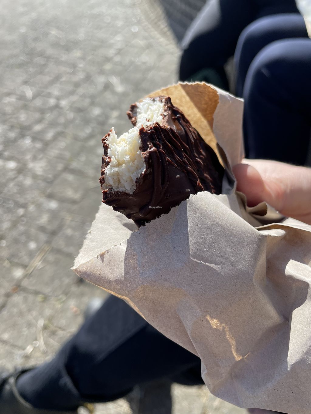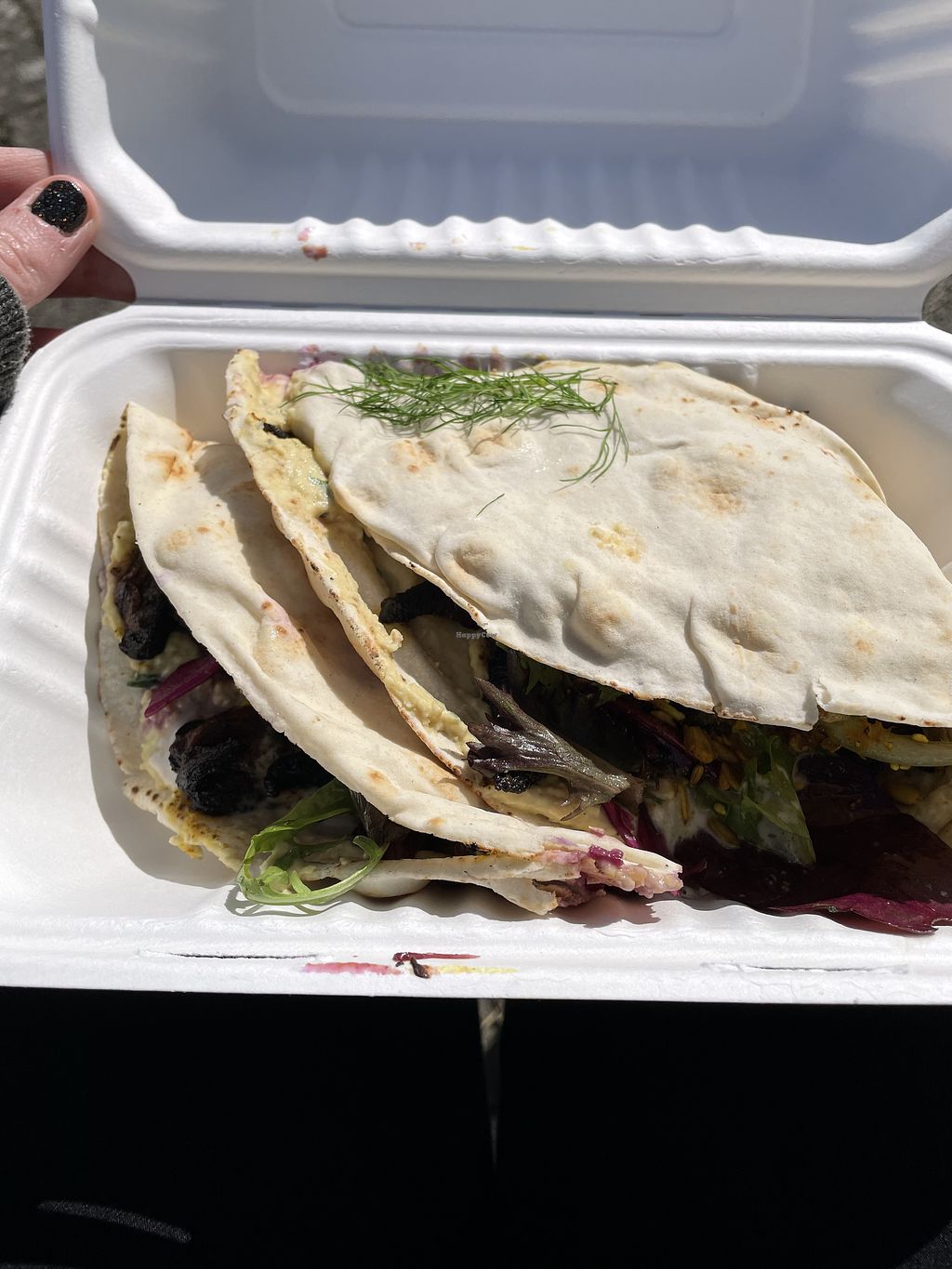 We arrived about 2pm on a very sunny Sunday and the place was full (it’s not very big to begin with), with several tables occupied outside also. We were about to leave disappointed but asked if they done takeaway and they did! It didn’t take long for our four orders, and we ate it across the road overlooking the sea where there’s plenty of seating (we were super lucky with the weather)! I had a tandoori mushroom flatbread and it was heavenly! The mushrooms were cooked and flavoured perfectly, and came with hummus, pickles and tabbouli. Little bit messy to eat without a table, but worth it. My partner and I shared a vegan dark chocolate “bounty” bar, which was incredible and my only regret is not buying another.