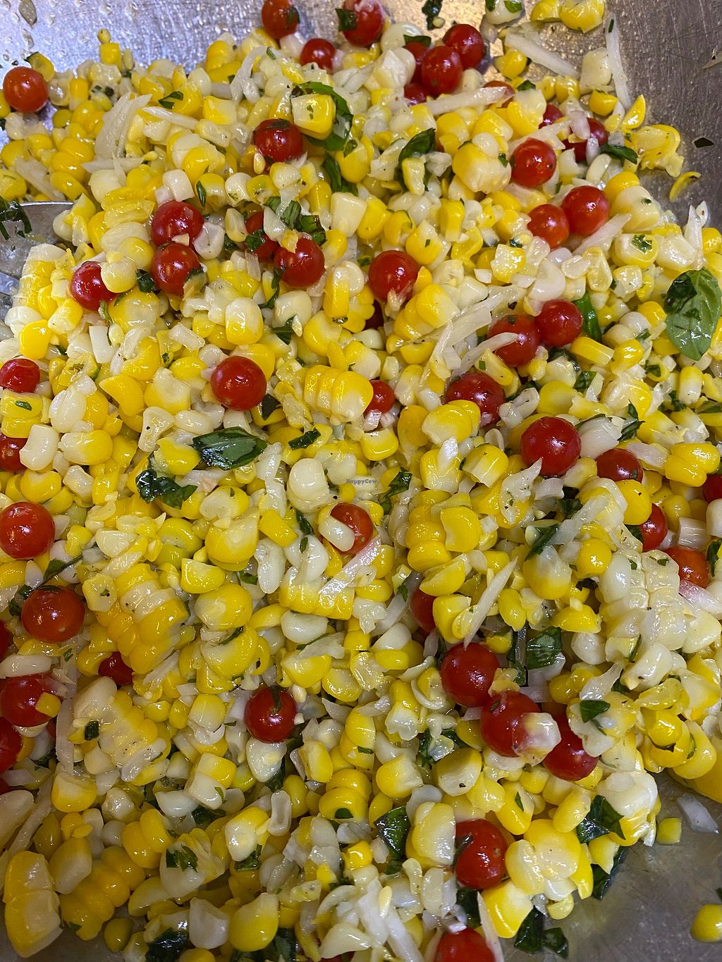 A summer favorite; local sweet corn salad with basil, onions, and toma…