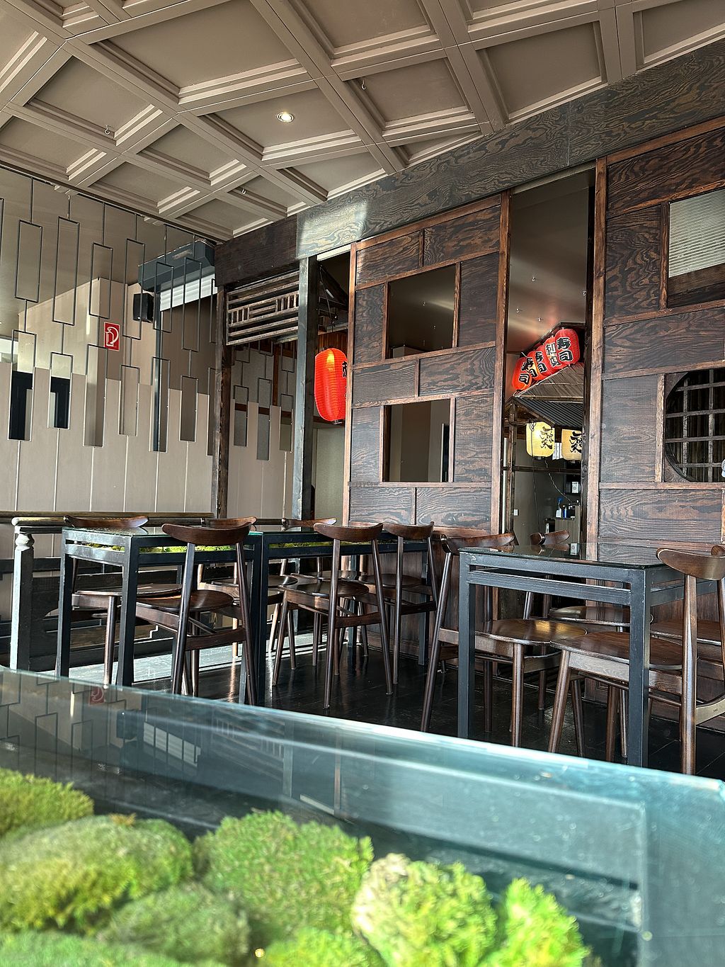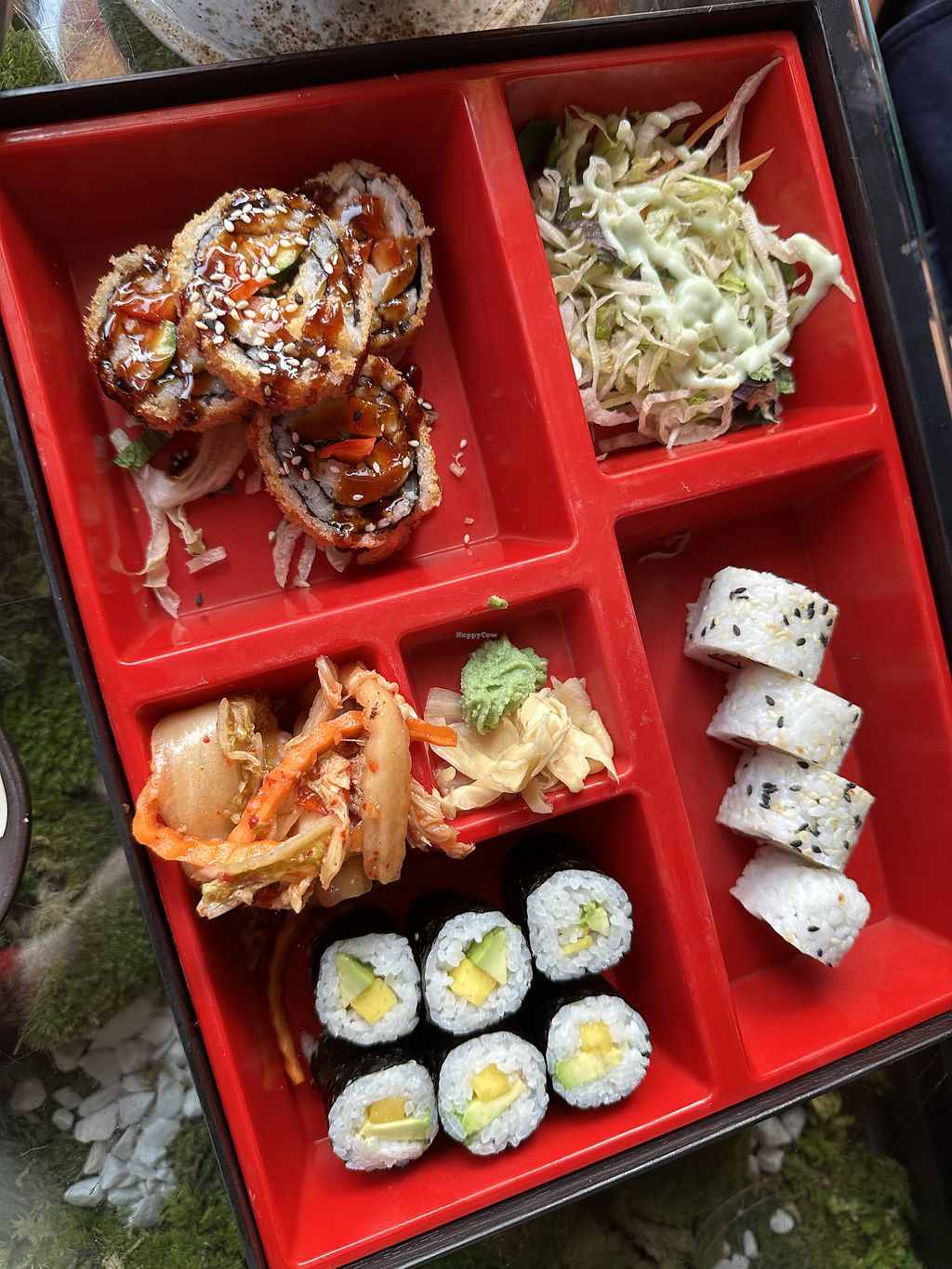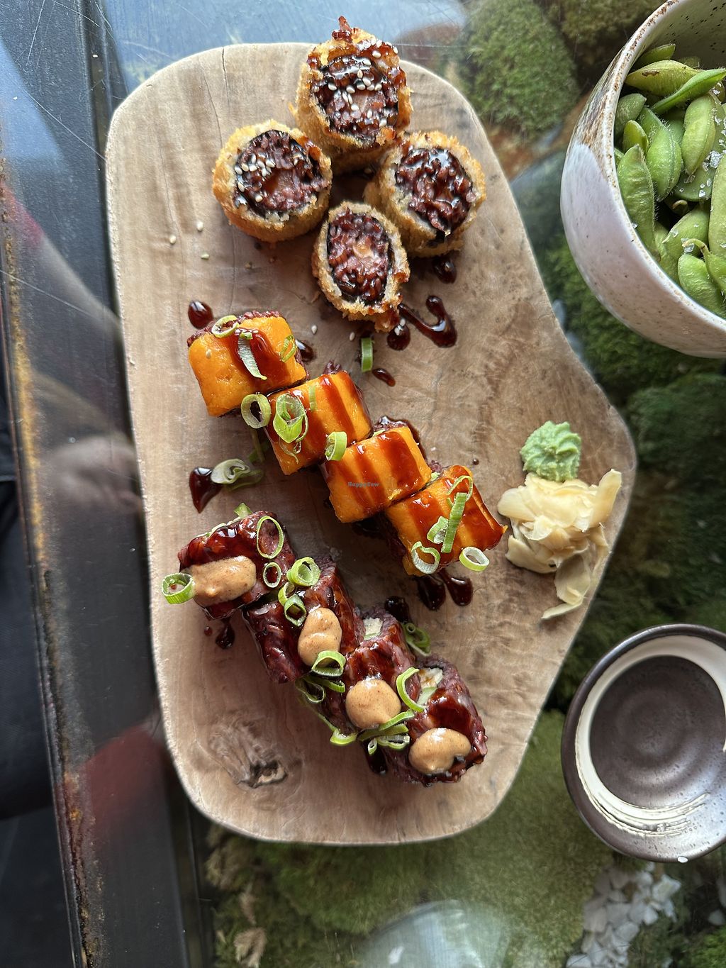 The restaurant is above a complete vegan Rewe supermarket (bonus points). We ordered a menu for 4 and it comes with a lot of different pieces - edamame, crispy rolls, seaweed, nigiri, sushi, etc. I liked every single one of them, as well as the presentation. Some tables have a view to the street from above. The tables have moss below the glass which gives an extra nice touch.
