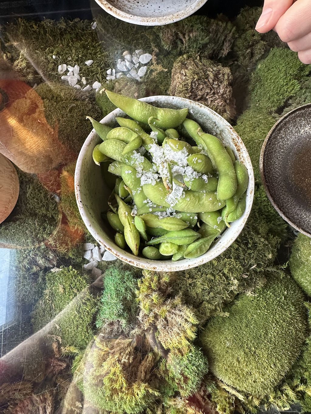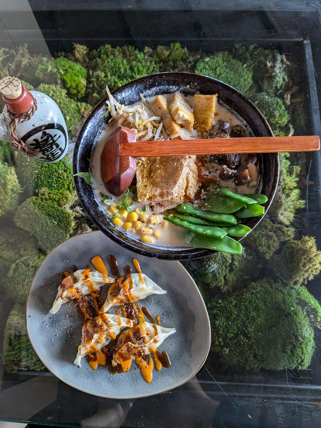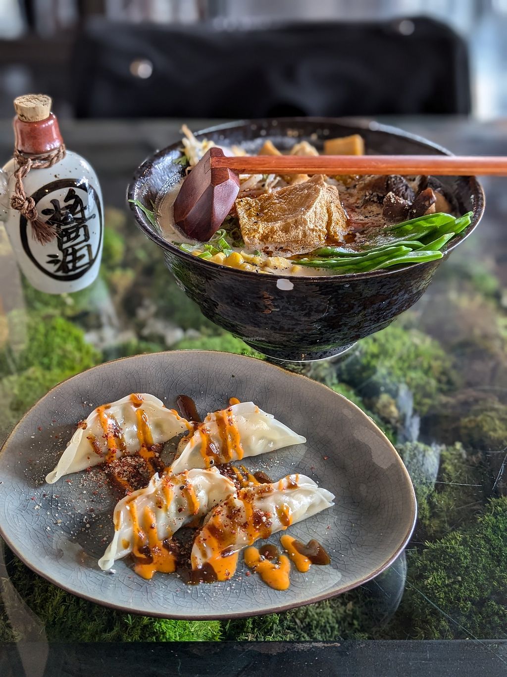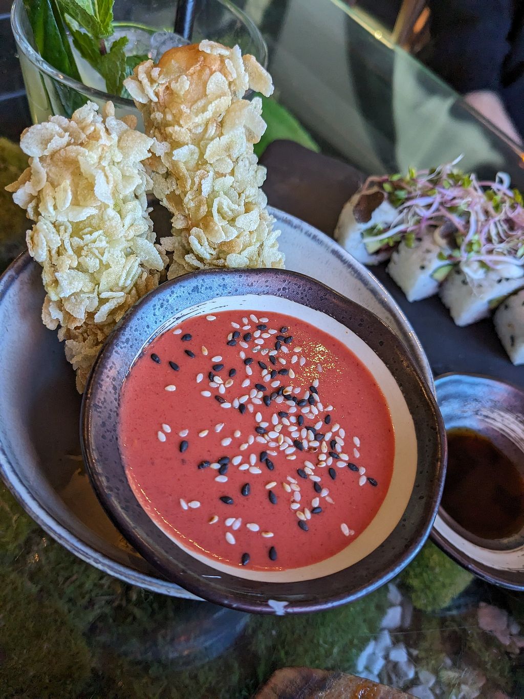 The restaurant is above a complete vegan Rewe supermarket (bonus points). We ordered a menu for 4 and it comes with a lot of different pieces - edamame, crispy rolls, seaweed, nigiri, sushi, etc. I liked every single one of them, as well as the presentation. Some tables have a view to the street from above. The tables have moss below the glass which gives an extra nice touch.
