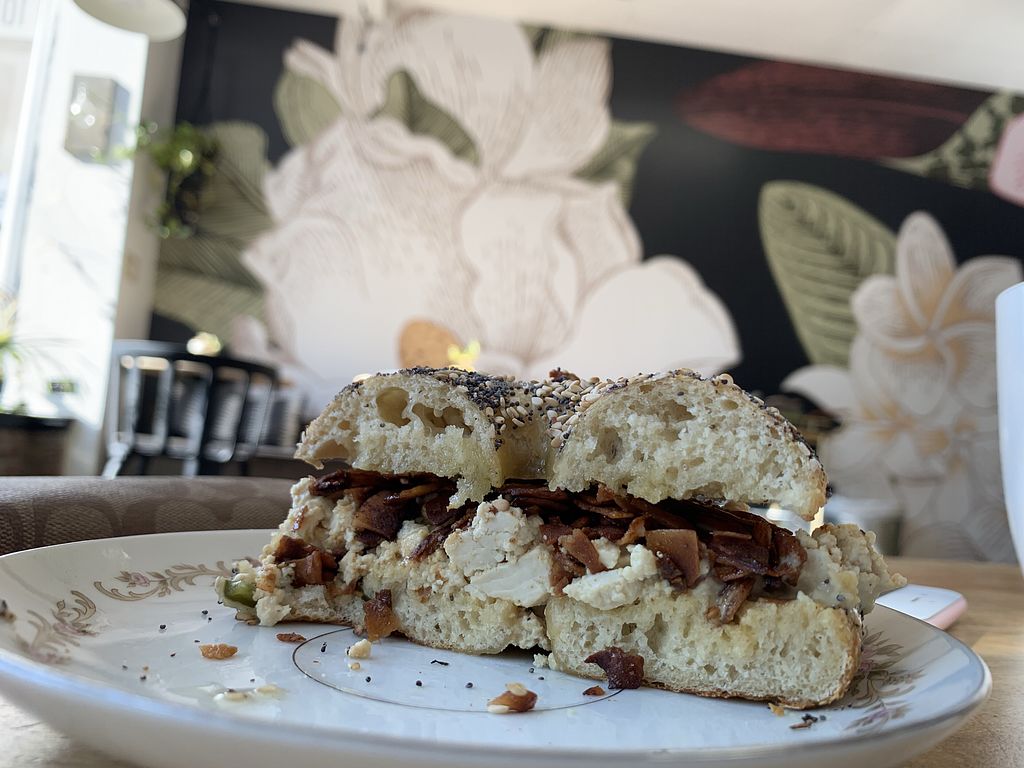 So delicious! Coconut bacon scram and “cheese” on jalapeño everything …