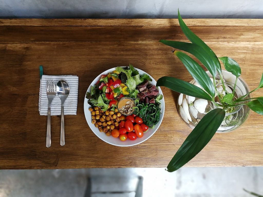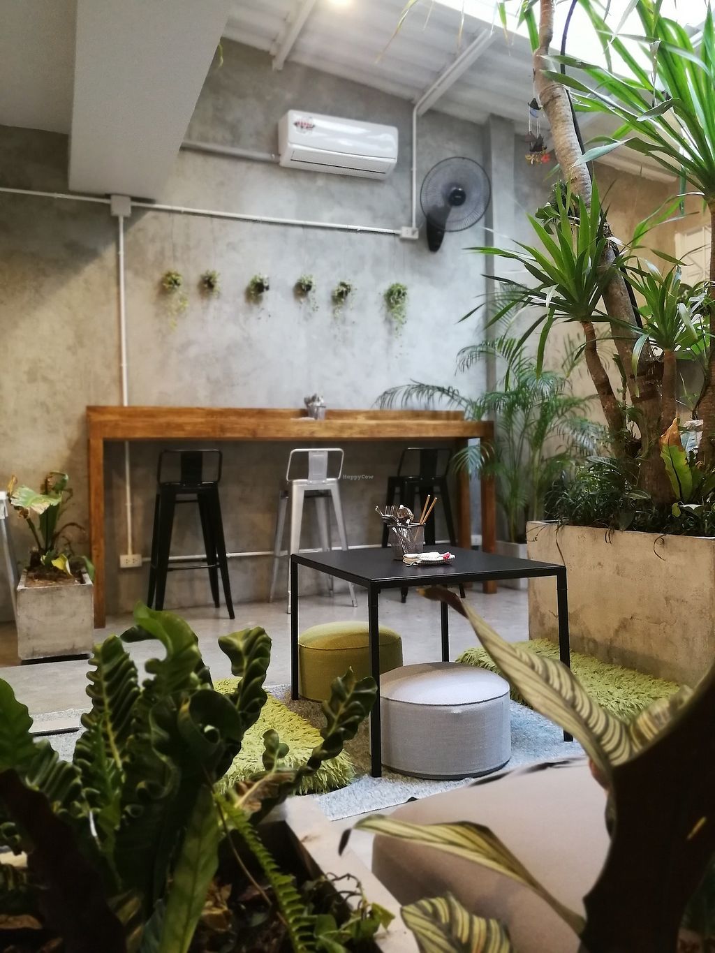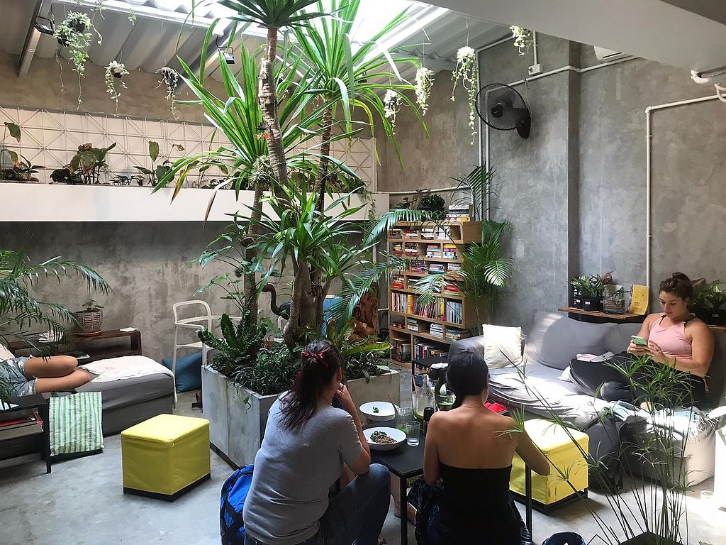 Indoor jungle at back of cafe with sofas, floor seating and library