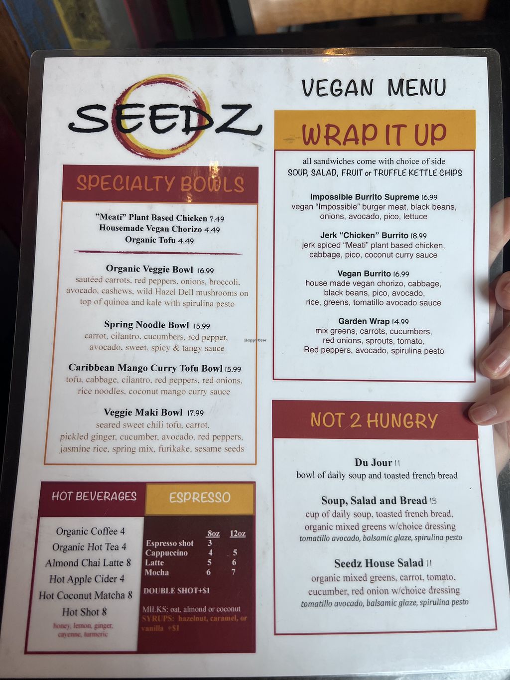 We loved Seedz and came here over 6 times in 2 weeks. We love that there is a whole vegan lunch and dinner menu, our lunch favorites were the vegan burrito, mango curry tofu bowl, and the chorizo lettuce cups. Anything with the chorizo is delicious! Our dinner favorites were the garlic edamame, mana pua (steamed buns with mushrooms) and the gochujang tofu with mushrooms. We loved the lemonade and guava lemonade, and the chocolate peanut butter ice cream was amazing. Customer service was wonderful every time we were there and highly recommended visiting this place if you’re in Steamboat!