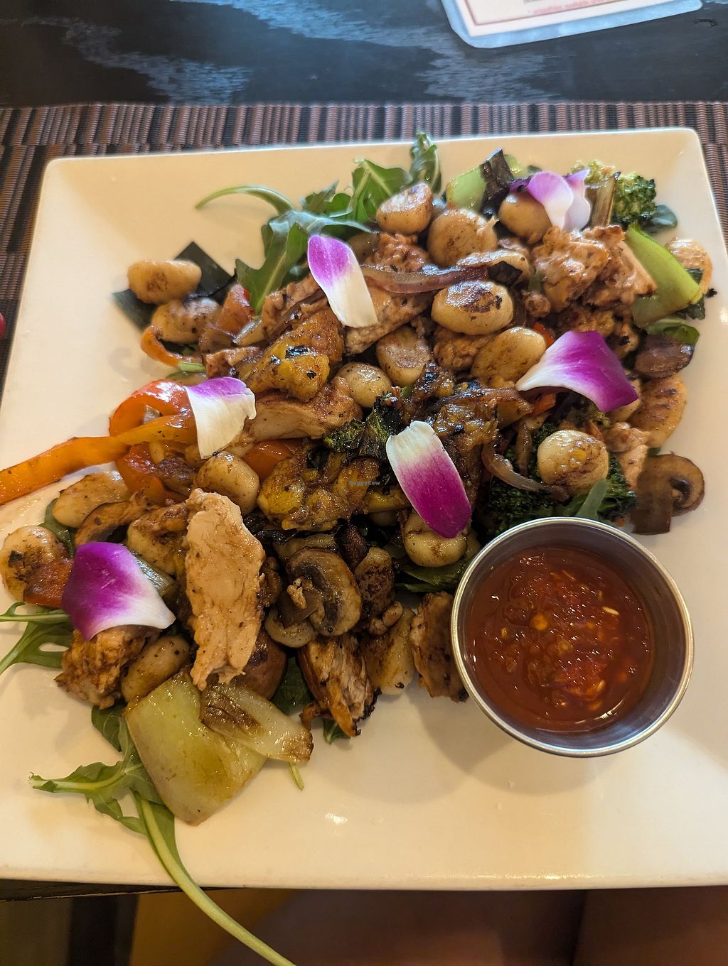 I had high hopes for this place. The service was okay. I did notice how differently she treated others after I came in. It wasn't busy at all until I left which is when people started coming in. She even gave me the check when I barely started eating my dinner. She didn't ask whether I wanted dessert. I thought that was rude. She smiled but I felt like there was an underlying annoyance that she had for some reason. It was super overpriced for what you got. It was a mediocre stir fry and I made the mistake of adding the so-called chicken which added almost $8 to it. My bad. I should have asked but I never thought it would be $8. The entree is already $30. I had the potato and plantain gnocchi thing which was basically a stir fry. I would have rather gone to Natural grocers 5 minutes away and just picked up a bunch of stuff to eat. I don't think I would go back. They have a parking lot for their customers just FYI.