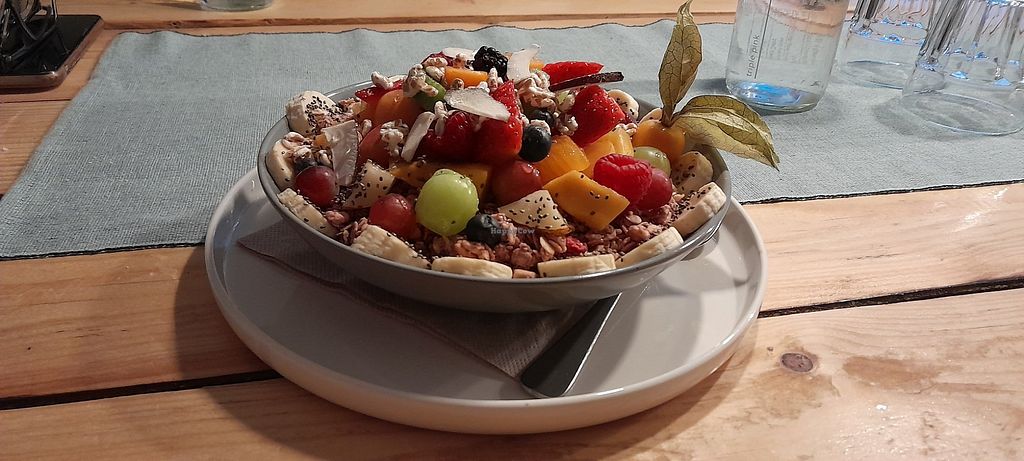 “Sunny Crunchy Bowl for breakfast” with yogurt, granola & fruit #Vegan…
