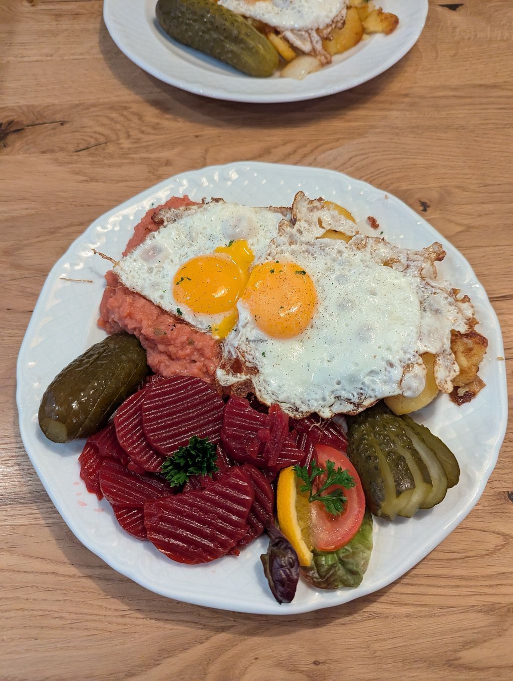 Bratkartoffeln mit Spiegelei rund saurer Gurke