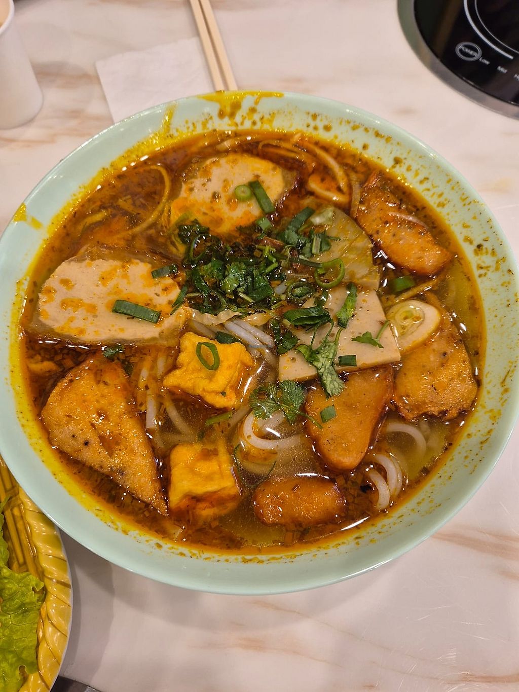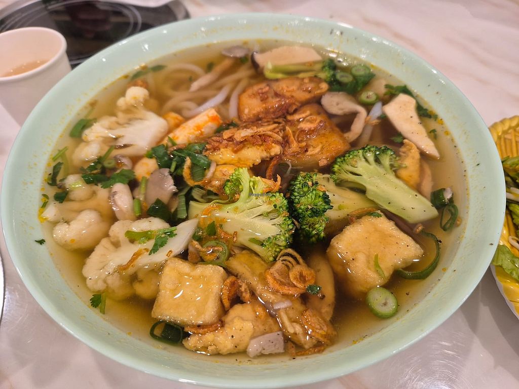 The stir fried flat noodle (dried) and banh canh/pork drop rice noodle soup are my absolute favourites so far, so tasty and a great mix of veggies, tofu, and fake meat.